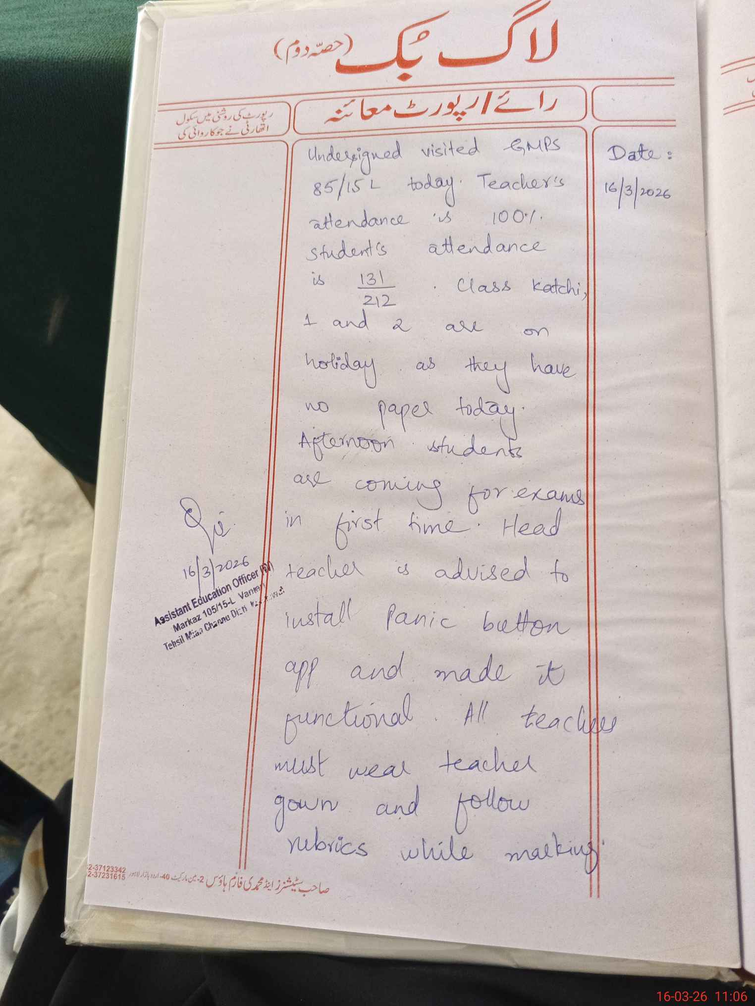 | Certified that this School was Inspected by the Undersigned MEA/DMO Today and the Information Stated Above is as Per Record. | |||||
