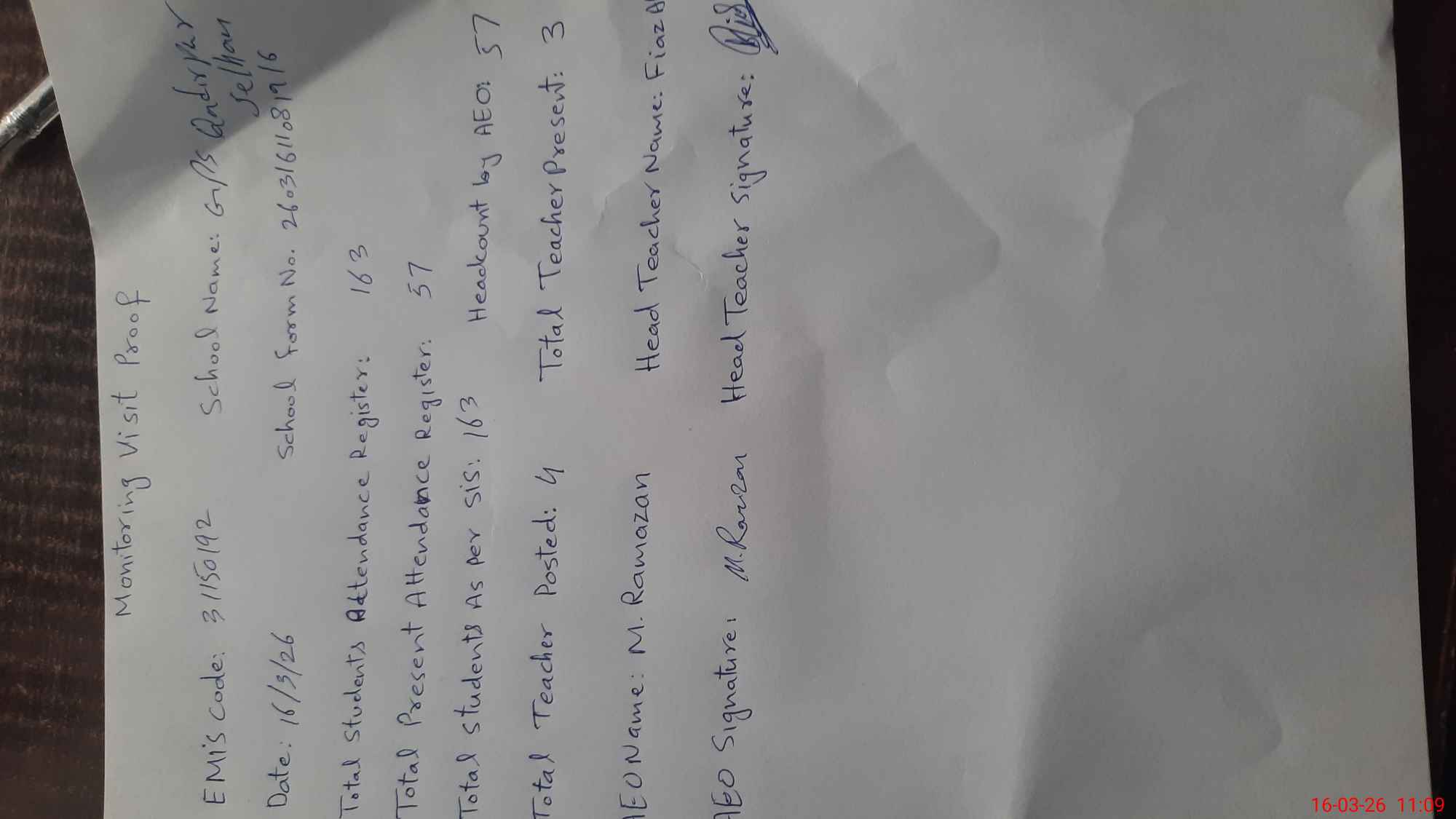 | Attendance Register | Head Teacher | MEA with School | Visit Proof |