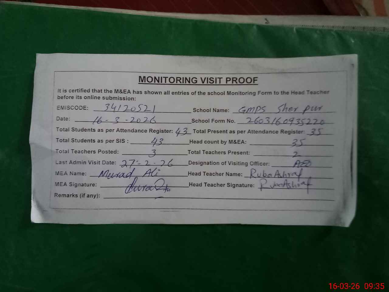 | EMIS Code: 34120521 | Name of School: GMPS SHER PUR | |||