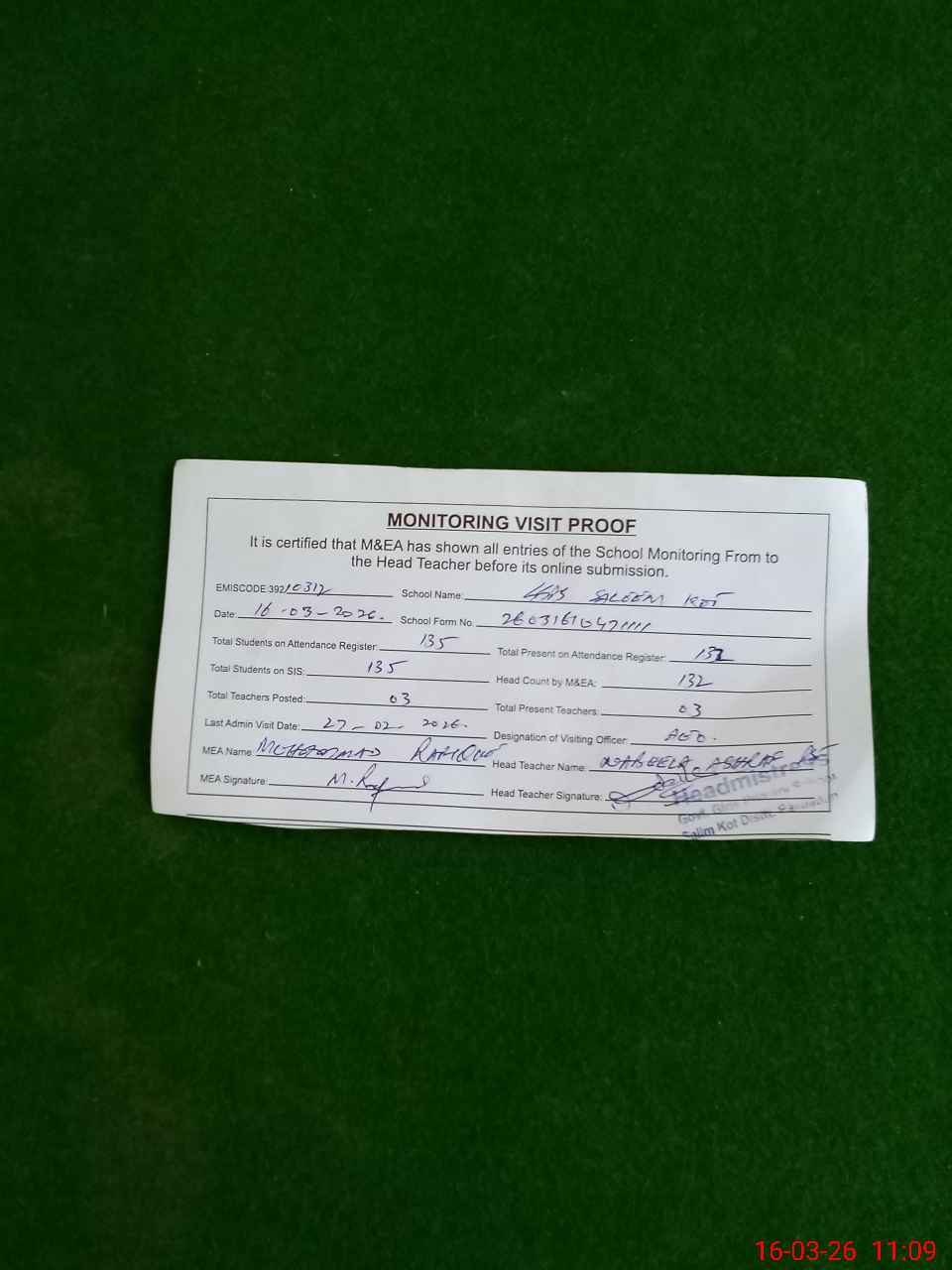 | Attendance Register | Head Teacher | MEA with School | Visit Proof |