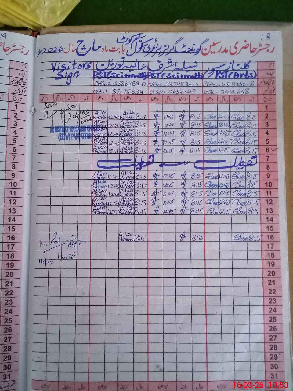 | Name: Na**** As**** Designation: (School Headmaster's/Headmistress's) PST Phone/Cell Number: 03**** |