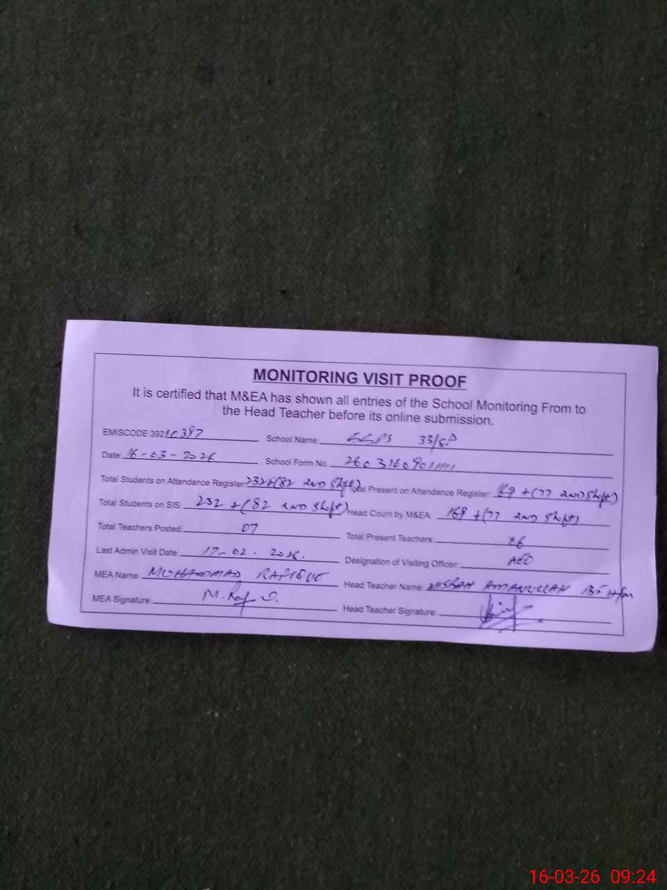 | Certified that this School was Inspected by the Undersigned MEA/DMO Today and the Information Stated Above is as Per Record. | |||||