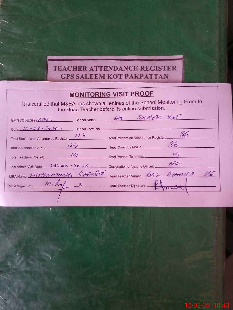 | Attendance Register | Head Teacher | MEA with School | Visit Proof |