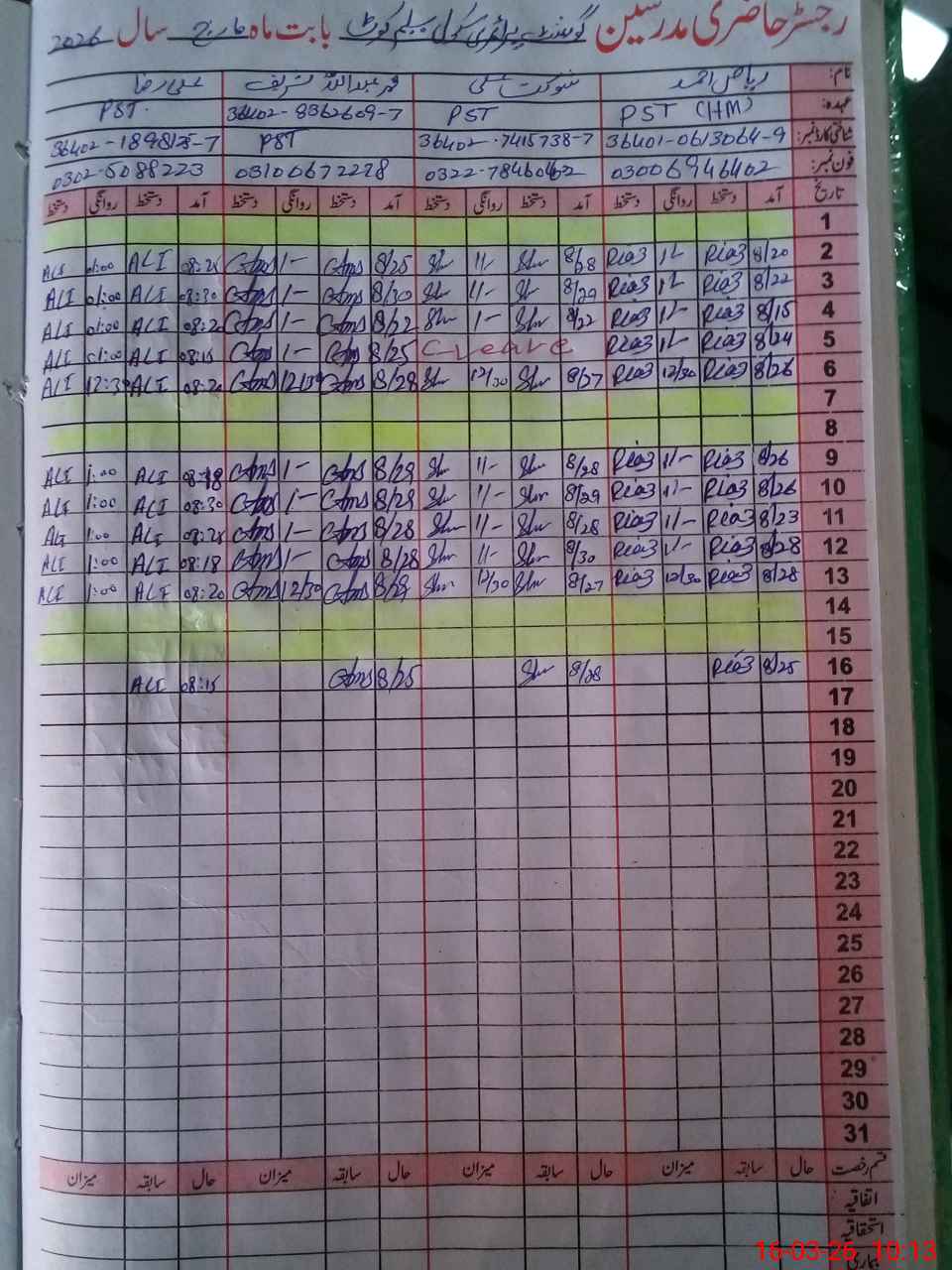 | Name: RI**** AH**** Designation: (School Headmaster's/Headmistress's) PST Phone/Cell Number: 03**** |