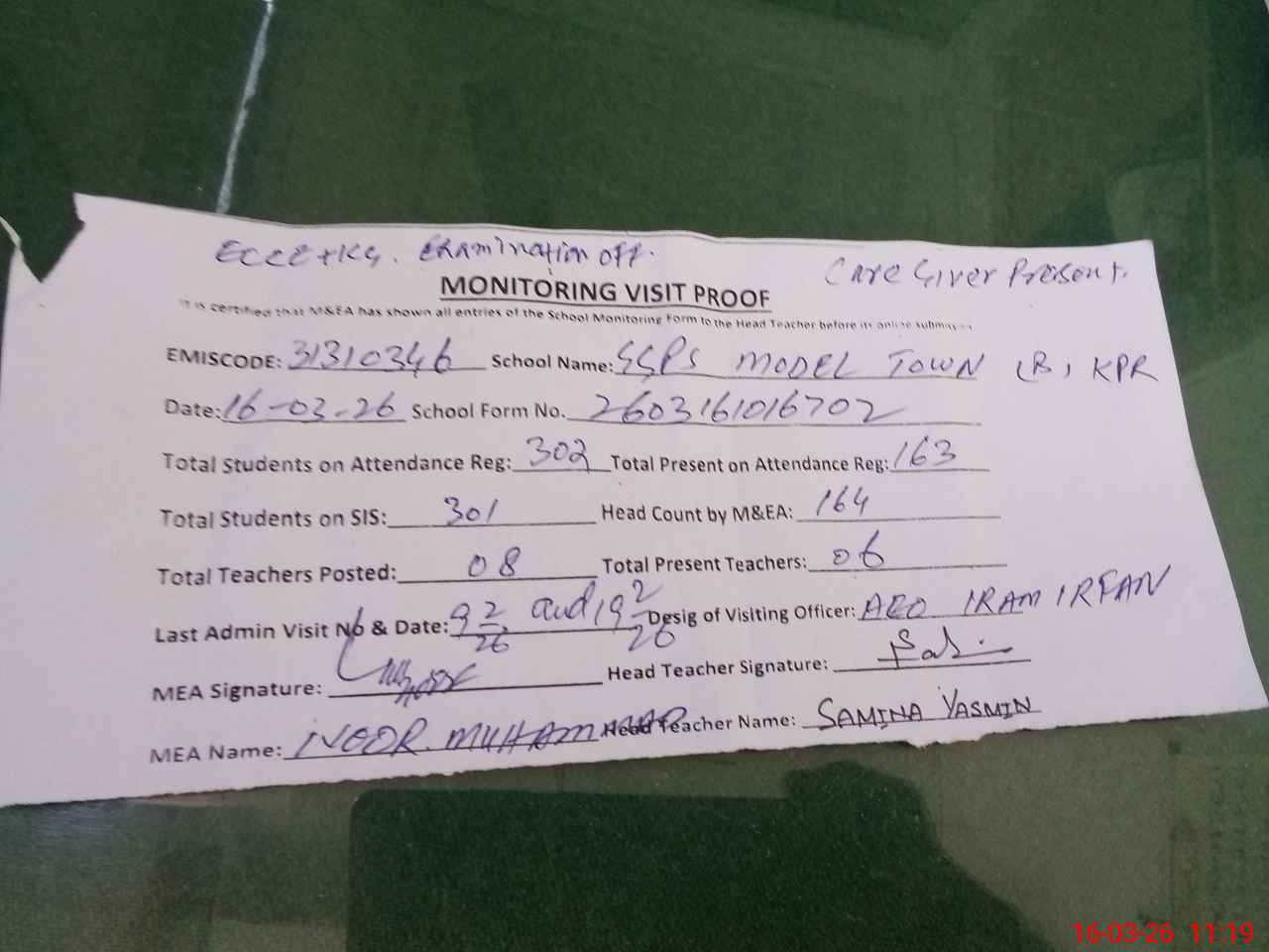| Attendance Register | Head Teacher | MEA with School | Visit Proof |