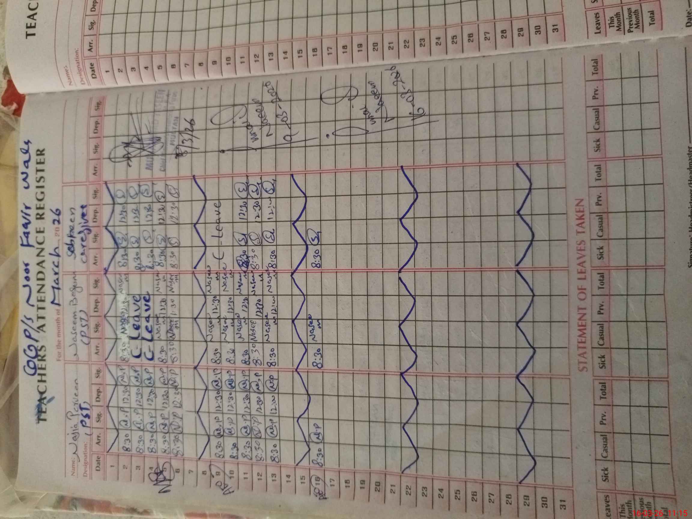 | CNIC | Full Name | Designation | R/C | Absence During Last Calender Month |