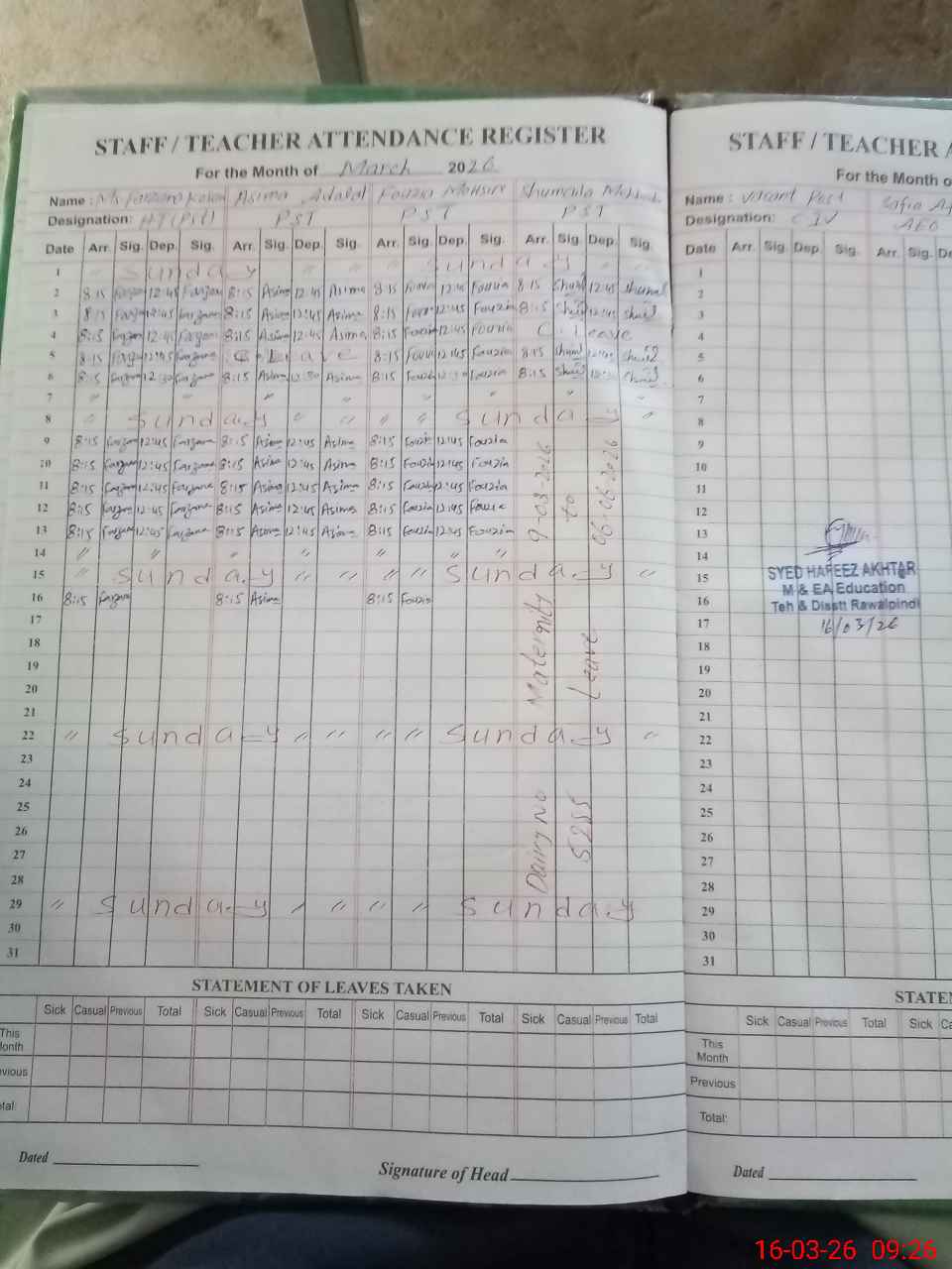 | Monitoring Date: 16-03-2026 | Start Time: 16-03-2026 09:04 AM | End Time: 16-03-2026 09:39 AM | Name of MEA: Sy**** Ha**** Ak**** | |