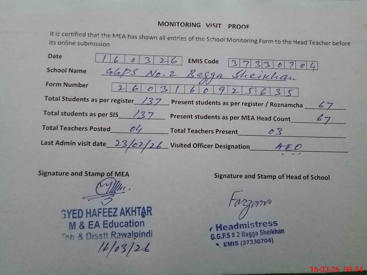 | Attendance Register | Head Teacher | MEA with School | Visit Proof |