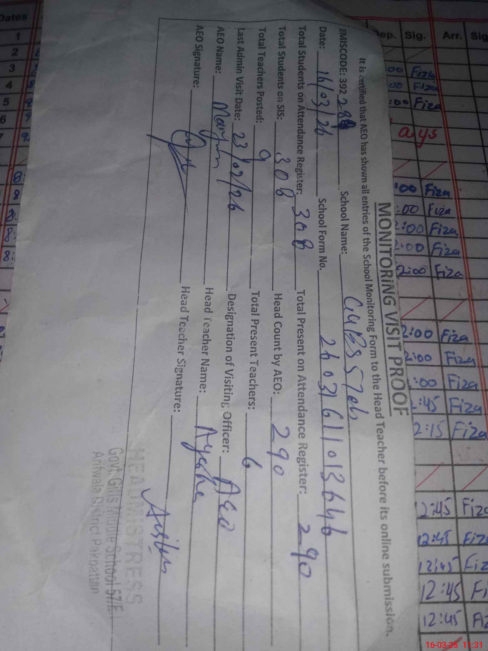 | Attendance Register | Head Teacher | MEA with School | Visit Proof |
