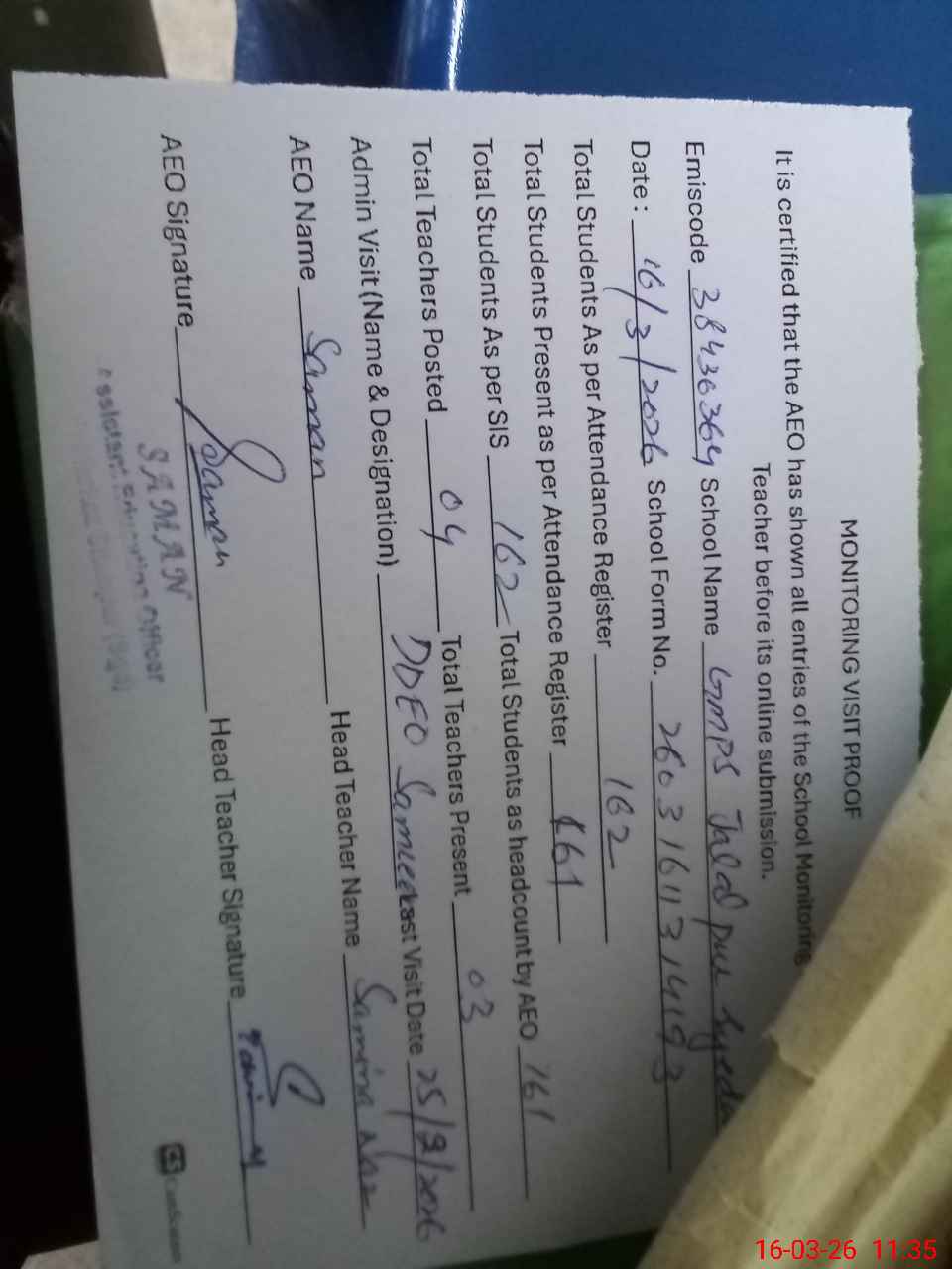 | Attendance Register | Head Teacher | MEA with School | Visit Proof |