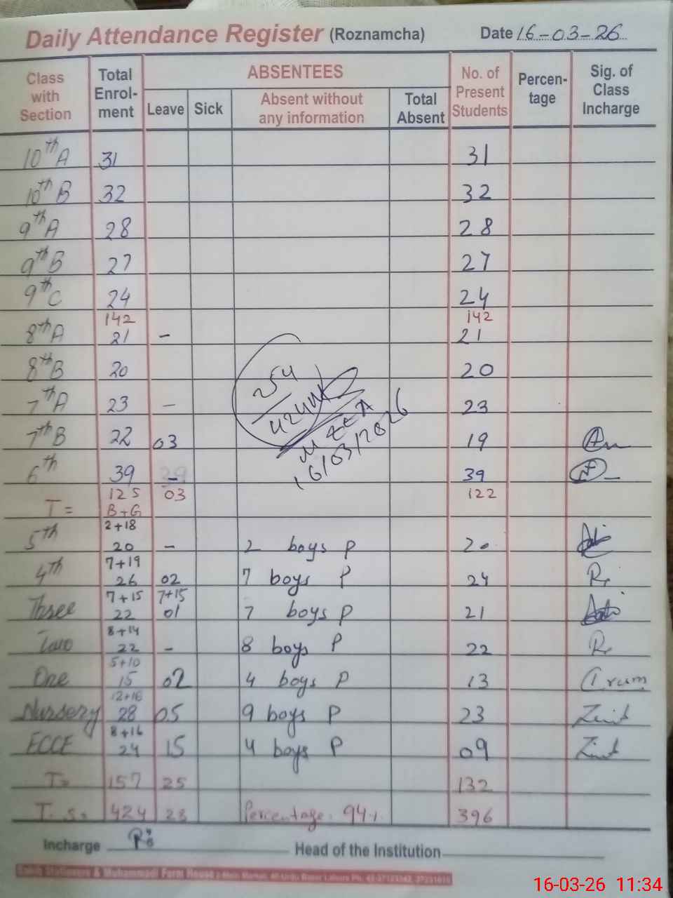 | Remarks (Use Separate Page if Required): 9th & 10th are not available at school due to no paper and online classes for both were in progress. | |||||