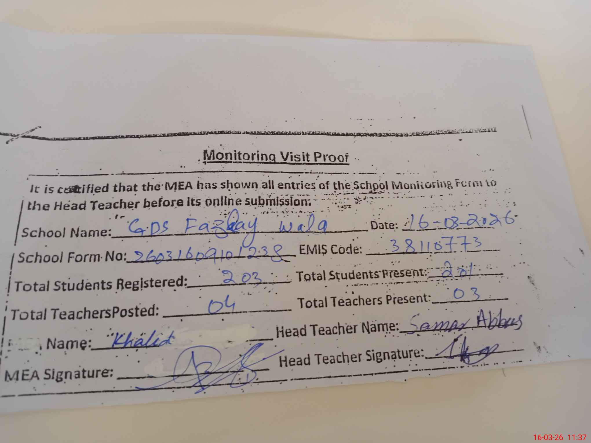 | Attendance Register | Head Teacher | MEA with School | Visit Proof |