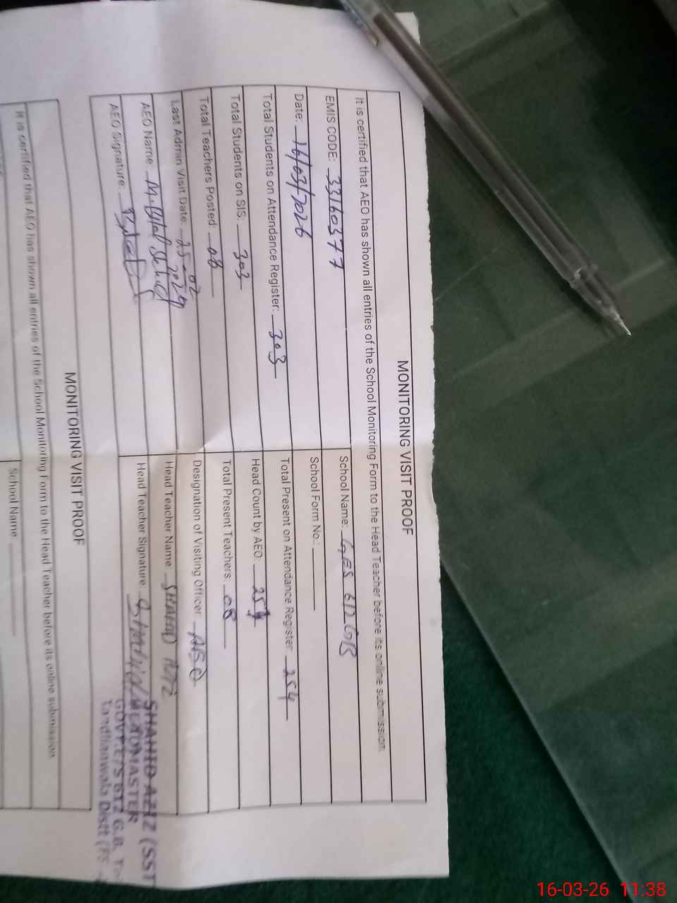 | Certified that this School was Inspected by the Undersigned MEA/DMO Today and the Information Stated Above is as Per Record. | |||||