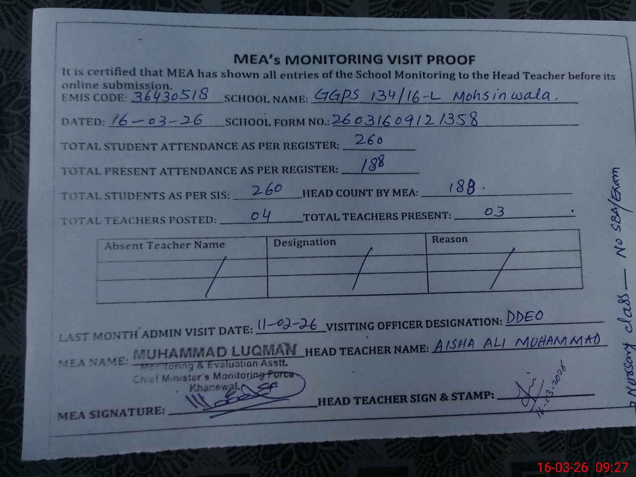 | EMIS Code: 36430518 | Name of School: GGPS CHAK NO. 134/16-L MOHSINWAL | |||
