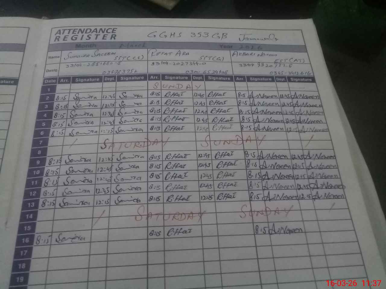 | CNIC | Full Name | Designation | R/C | Absence During Last Calender Month |