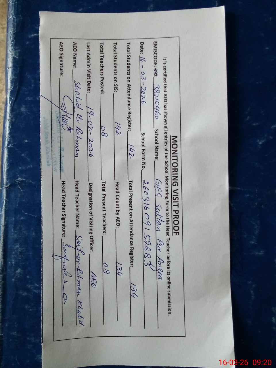 | Attendance Register | Head Teacher | MEA with School | Visit Proof |