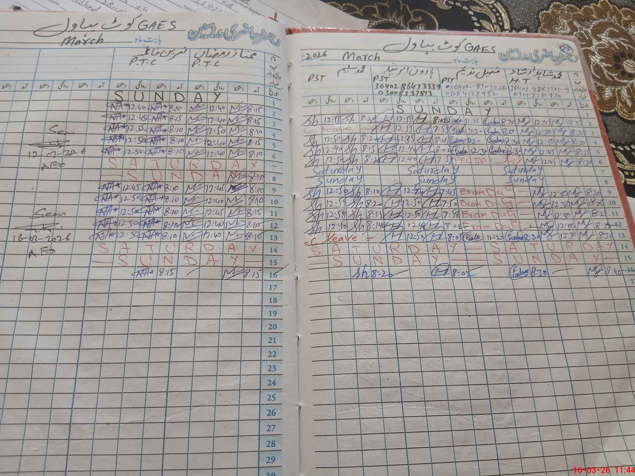 | Leave | Duty | Absent | Maternity | Medical | Ex- Pak |