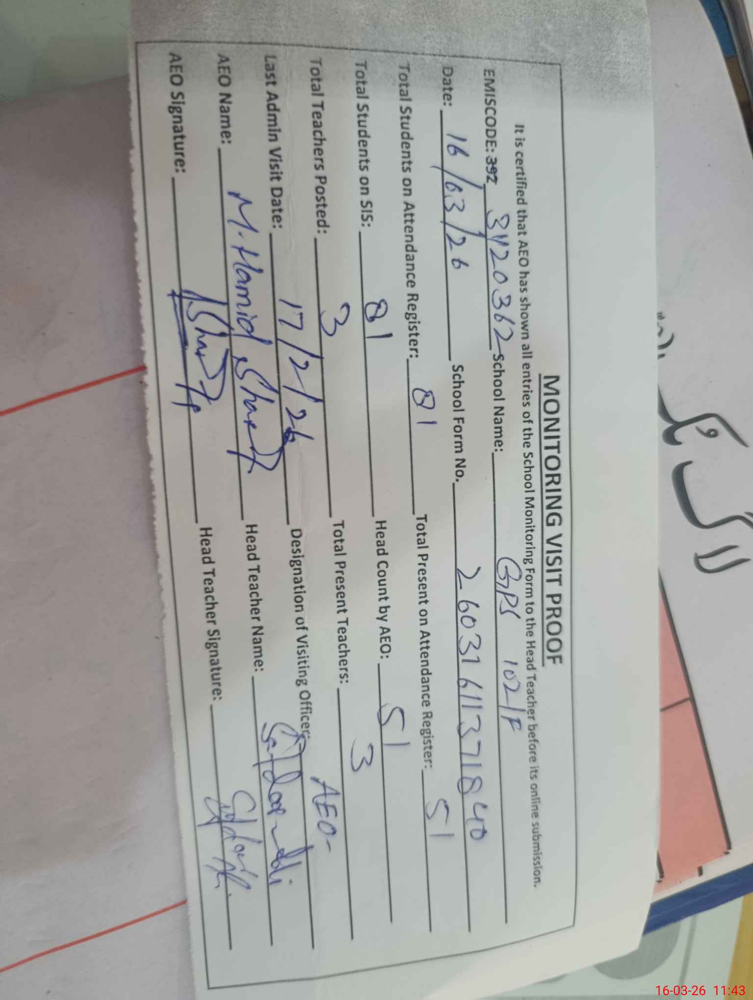 | EMIS Code: 31120362 | Name of School: GPS CHAK NO 102 F | |||