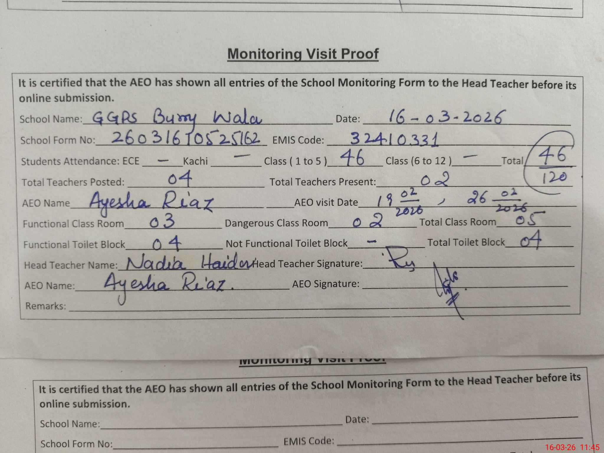 | Attendance Register | Head Teacher | MEA with School | Visit Proof |