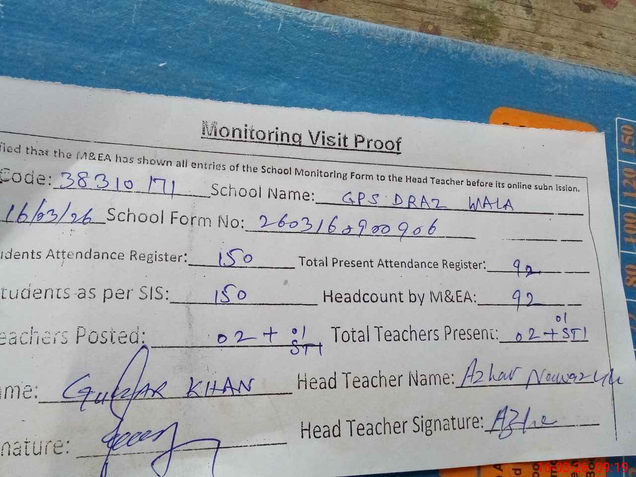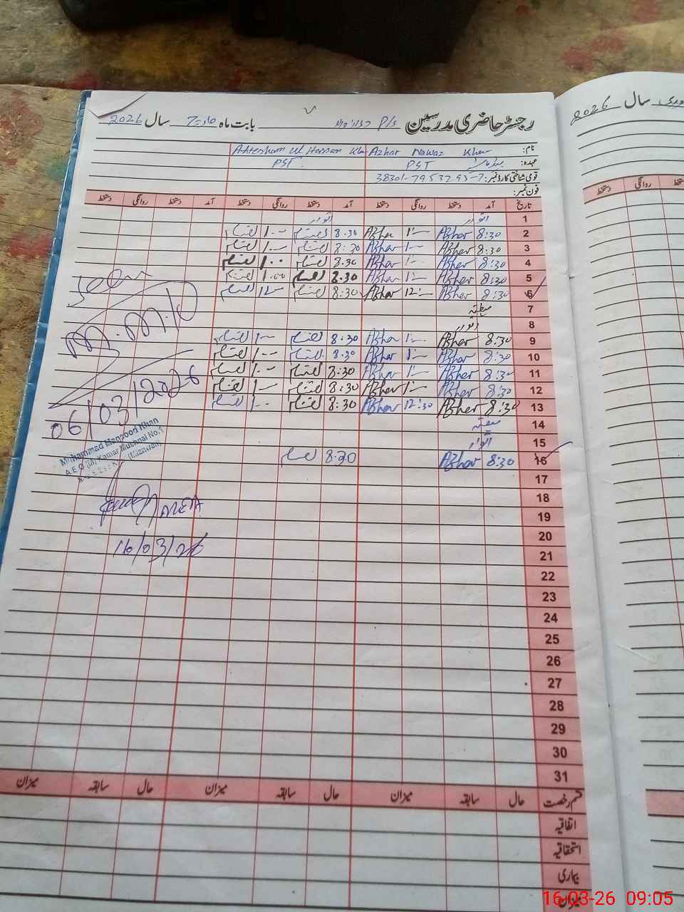| Name: Az**** Na**** Kh**** Designation: (School Headmaster's/Headmistress's) PST Phone/Cell Number: 03**** |