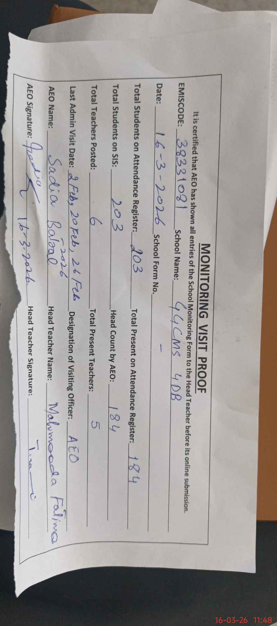 | Certified that this School was Inspected by the Undersigned MEA/DMO Today and the Information Stated Above is as Per Record. | |||||