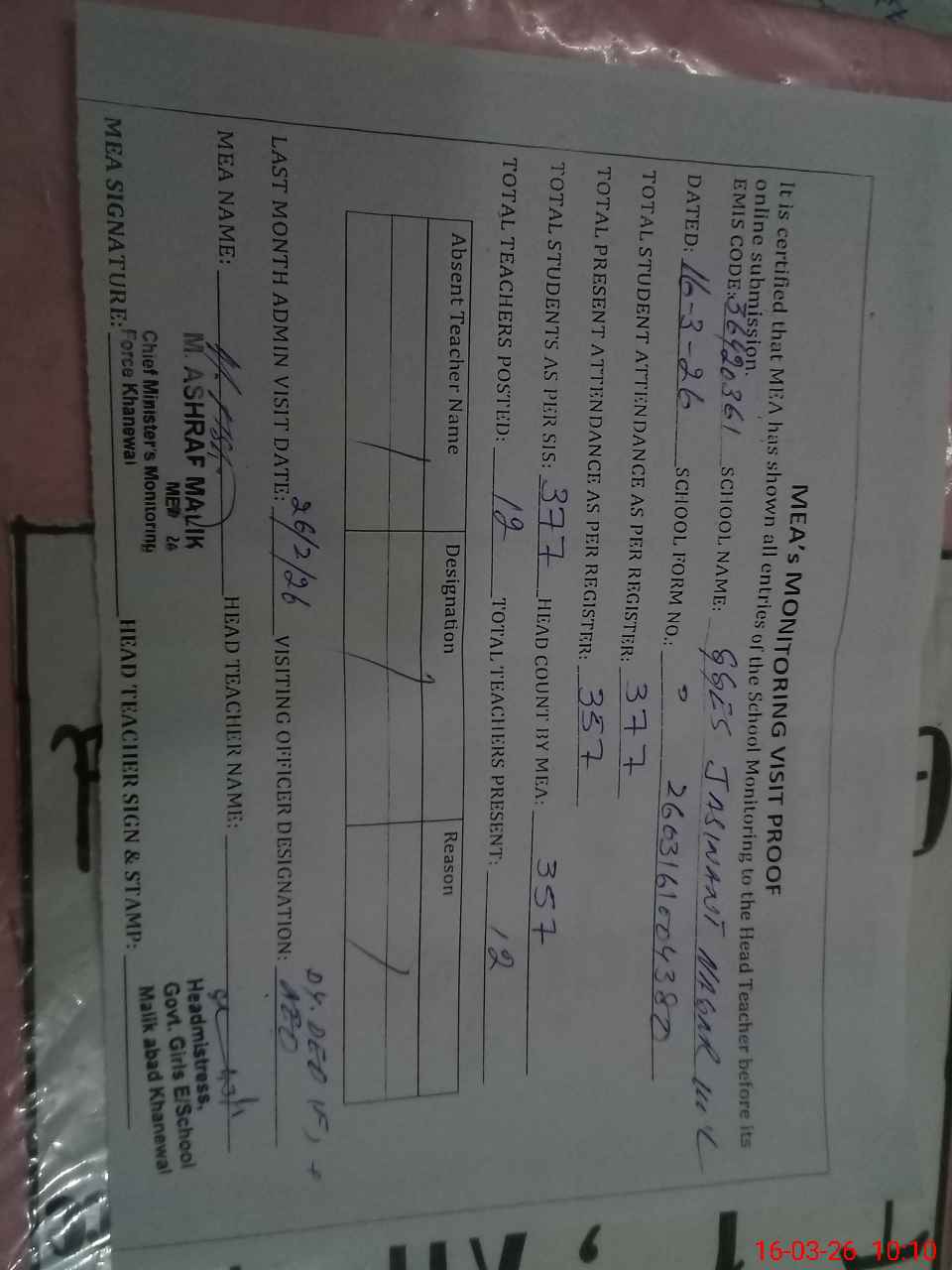 | Attendance Register | Head Teacher | MEA with School | Visit Proof |