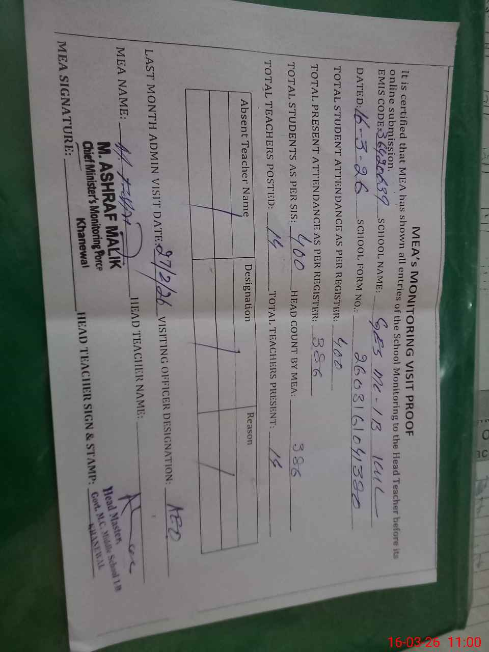 | Attendance Register | Head Teacher | MEA with School | Visit Proof |