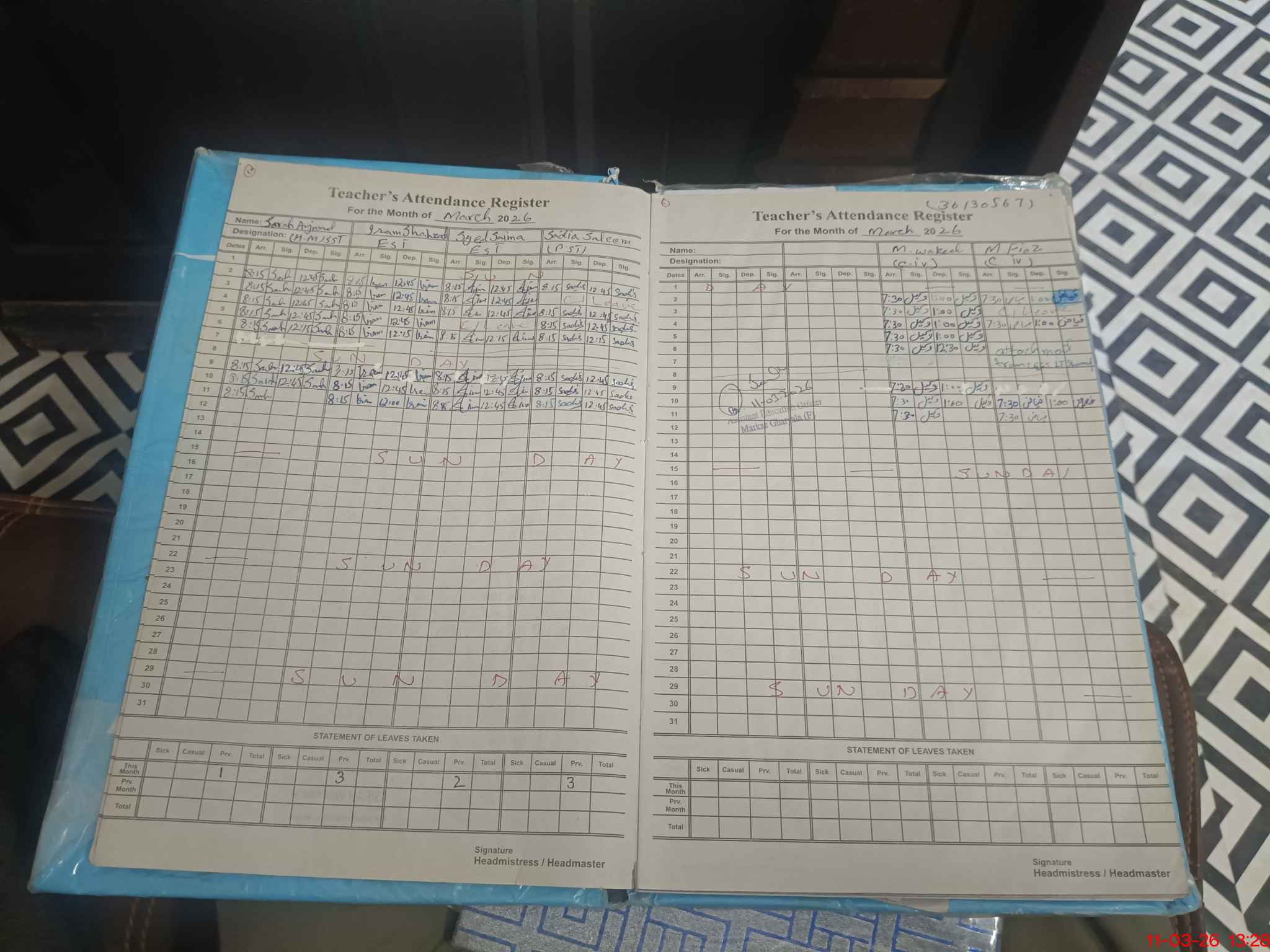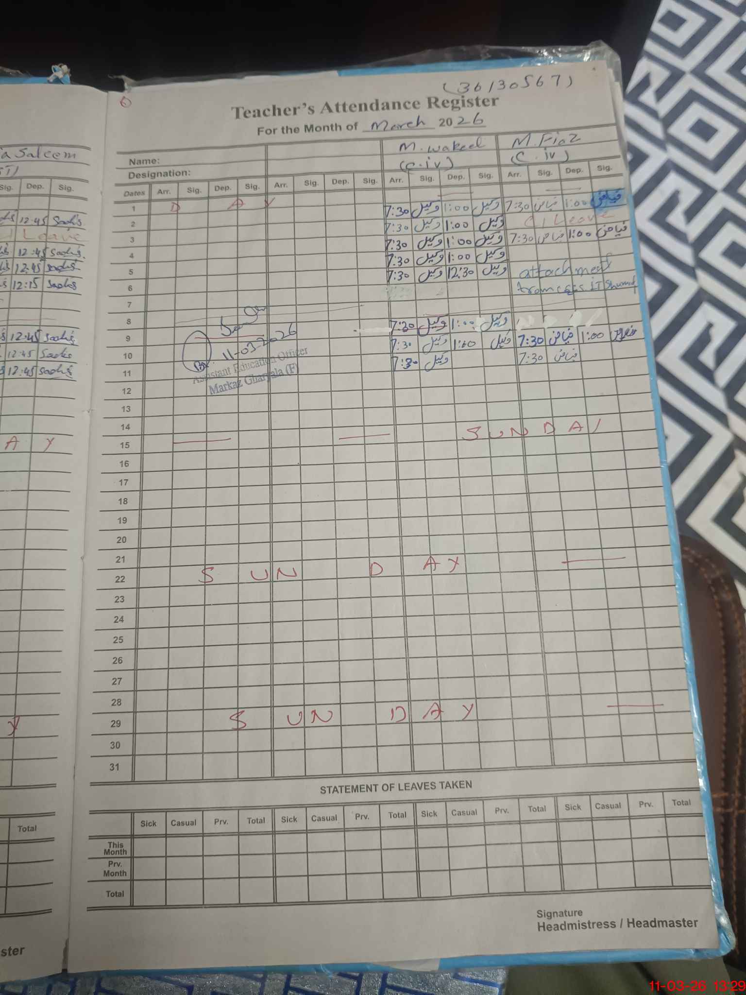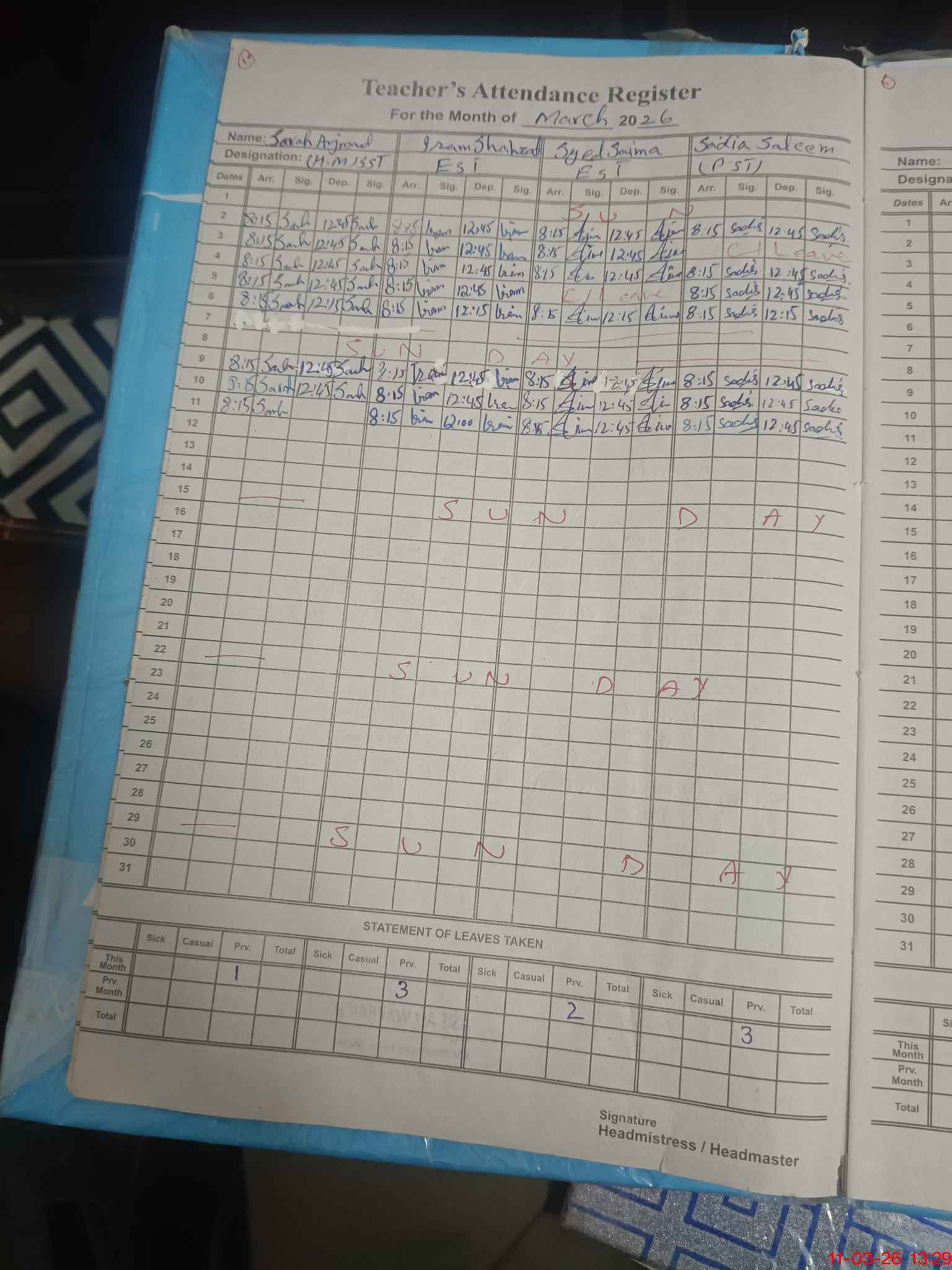 | Name: Sa**** Ar**** Designation: (School Headmaster's/Headmistress's) SST GEN Phone/Cell Number: 03**** |