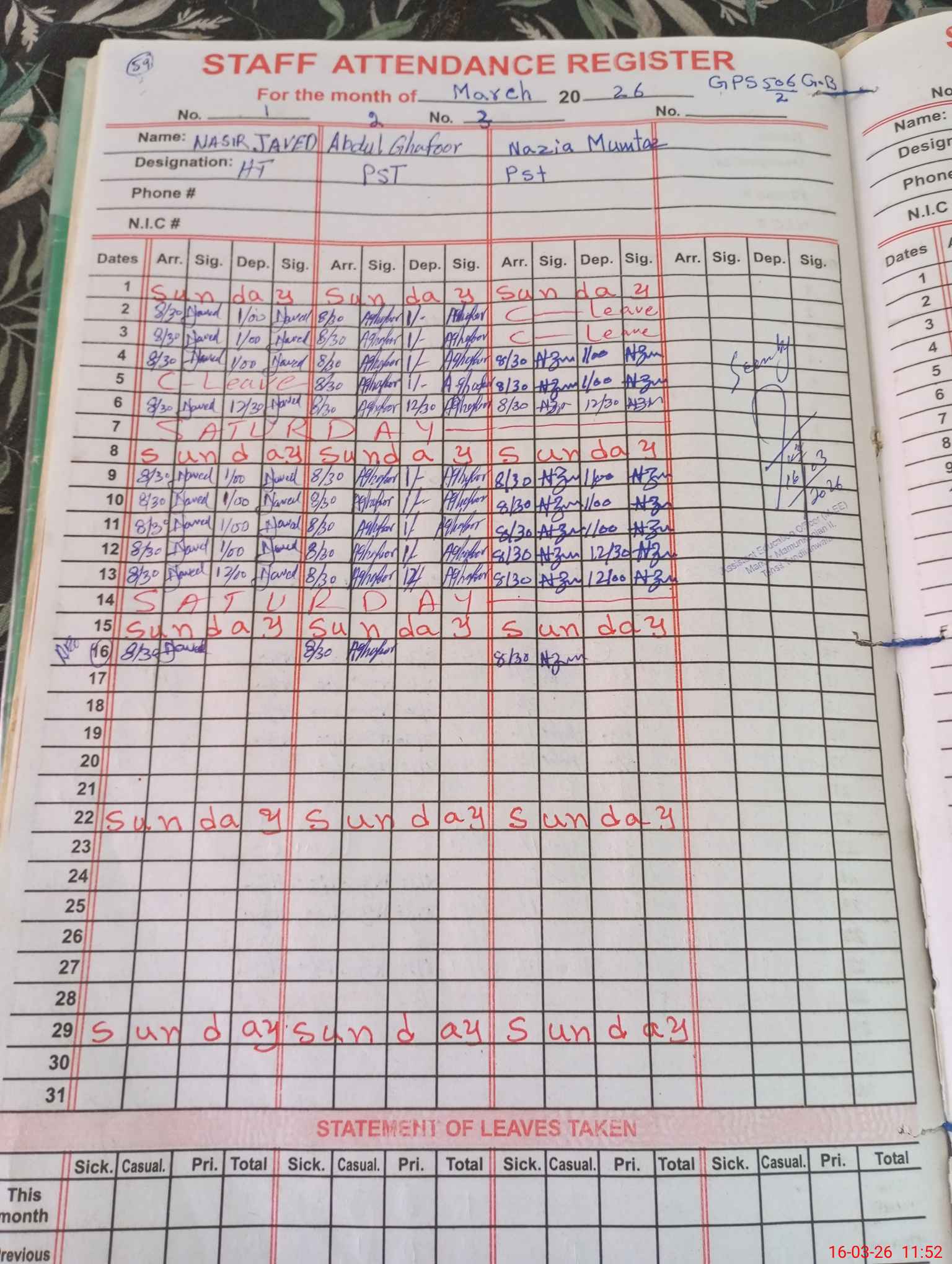 | CNIC | Full Name | Designation | R/C | Absence During Last Calender Month |
