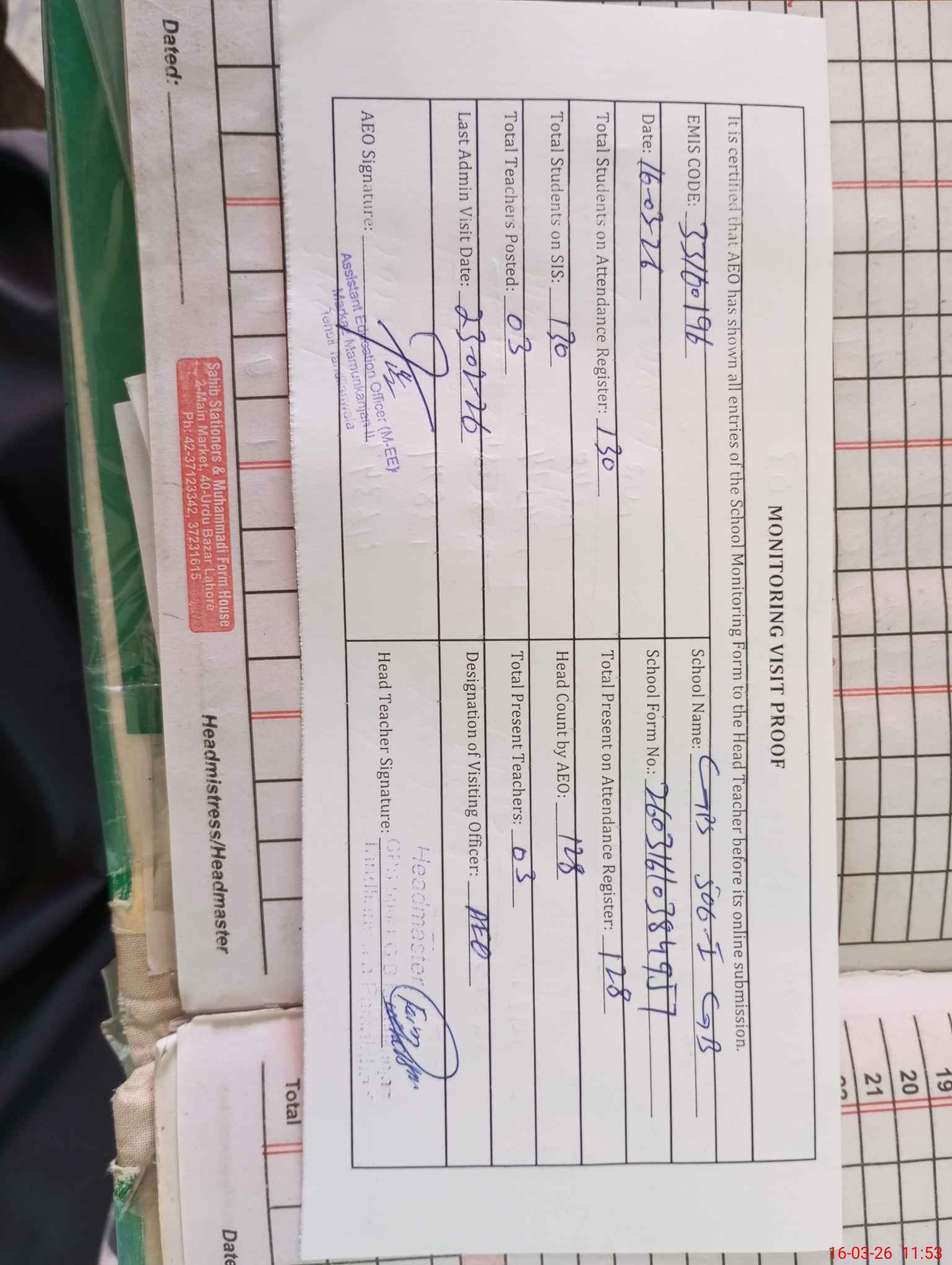 | Attendance Register | Head Teacher | MEA with School | Visit Proof |