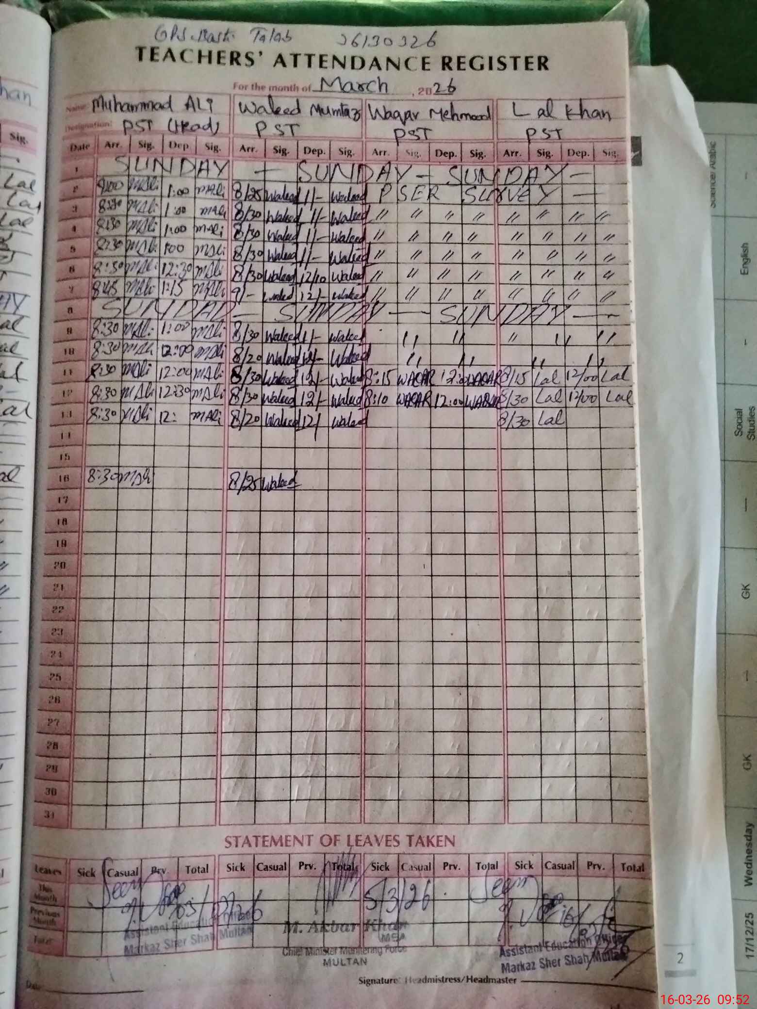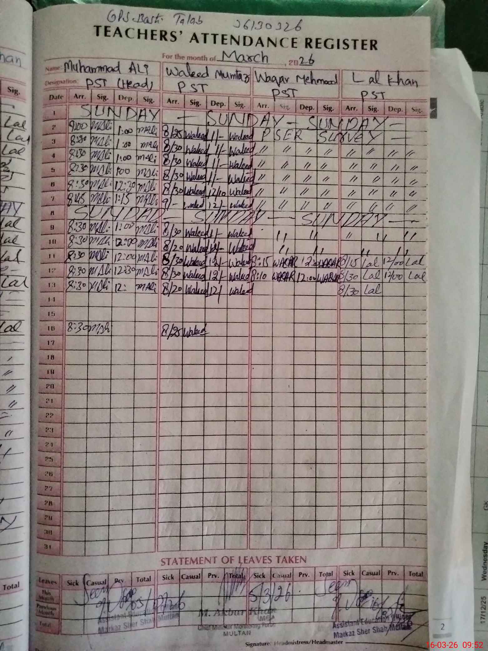 | EMIS Code: 36130326 | Name of School: GPS BASTI TALAB SULTAN PUR HAMER SHER SHAH | |||