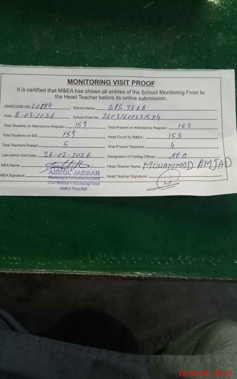 | EMIS Code: 39220184 | Name of School: GPS 73 EB P/O CHAK NO 75/EB | |||
