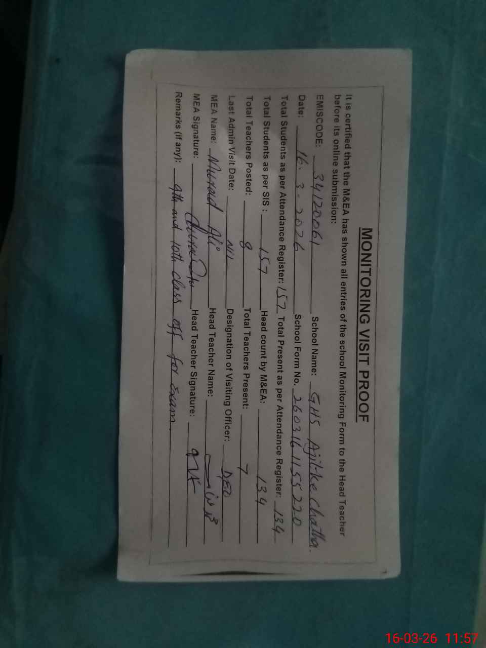 | Attendance Register | Head Teacher | MEA with School | Visit Proof |