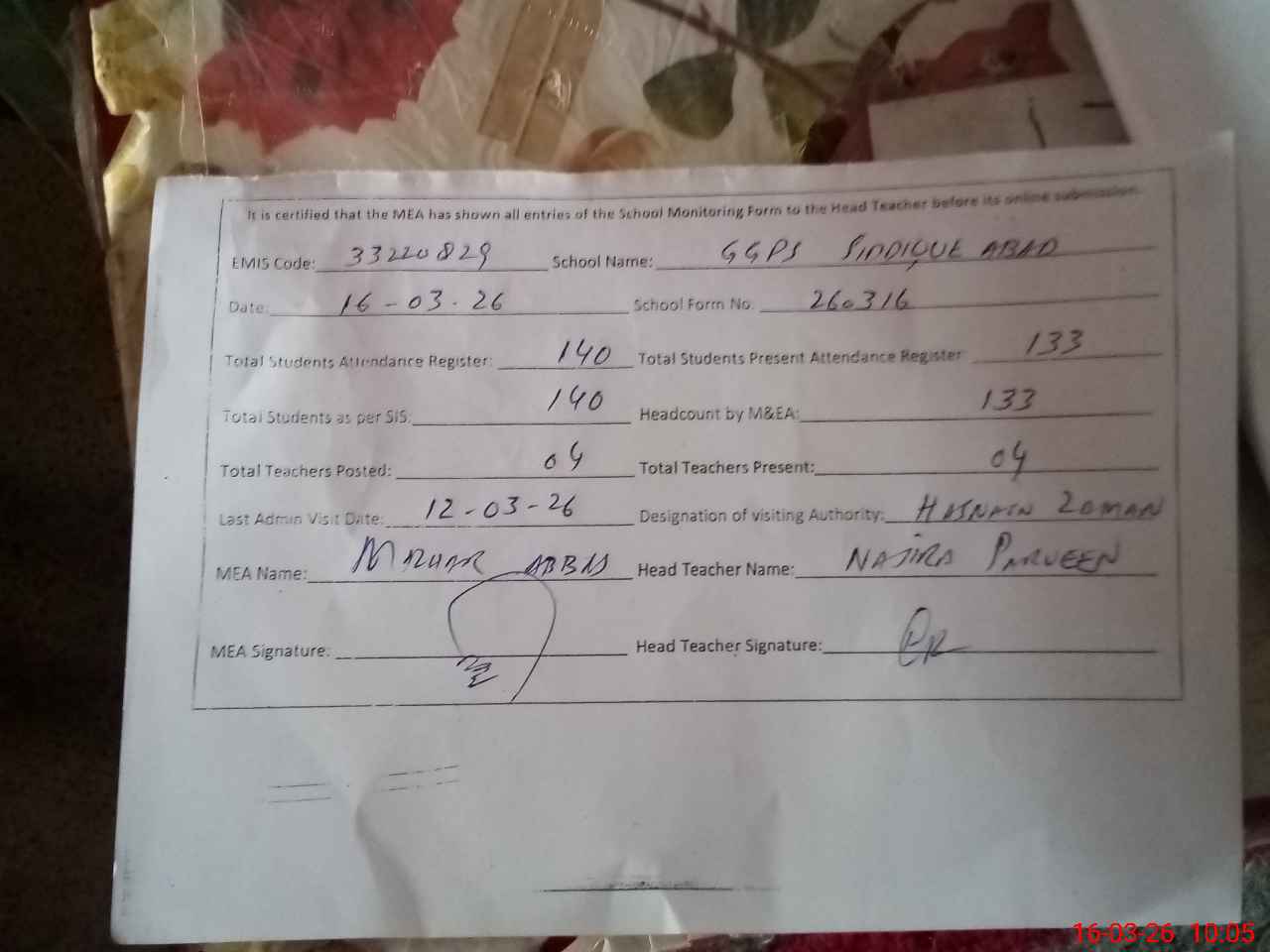 | Attendance Register | Head Teacher | MEA with School | Visit Proof |