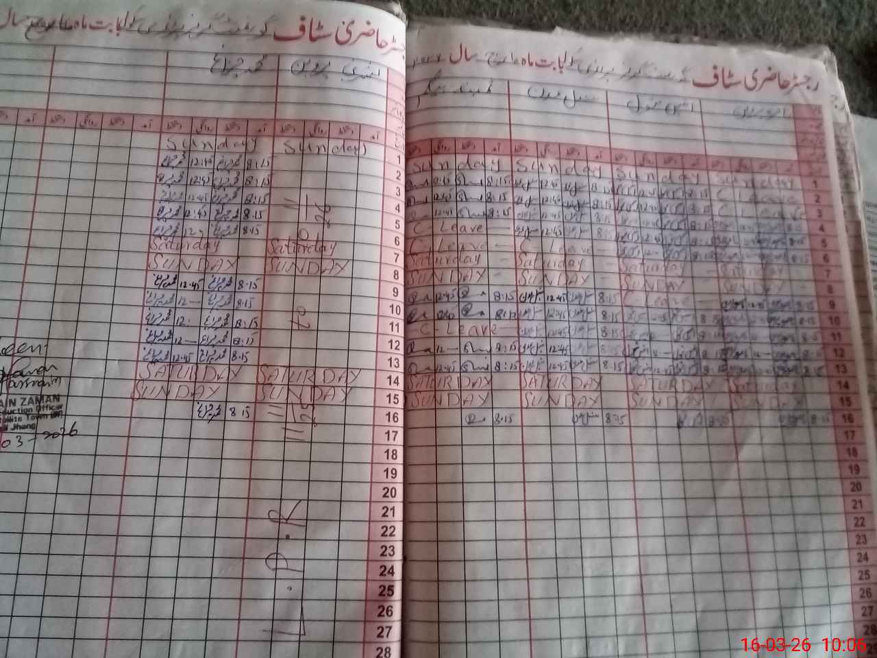 | CNIC | Full Name | Designation | R/C | Absence During Last Calender Month |