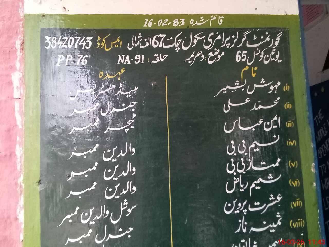 | EMIS Code: 38420743 | Name of School: GGPS CHAK NO. 67-A/NB | |||