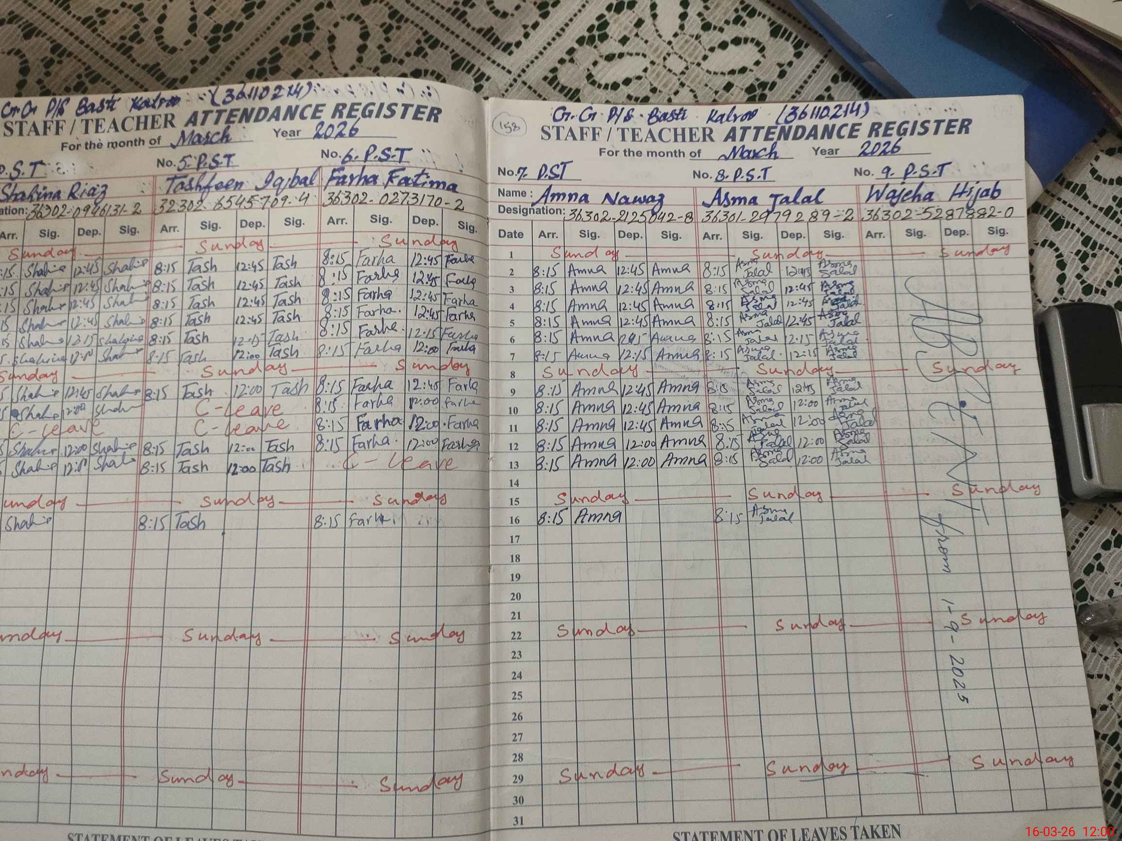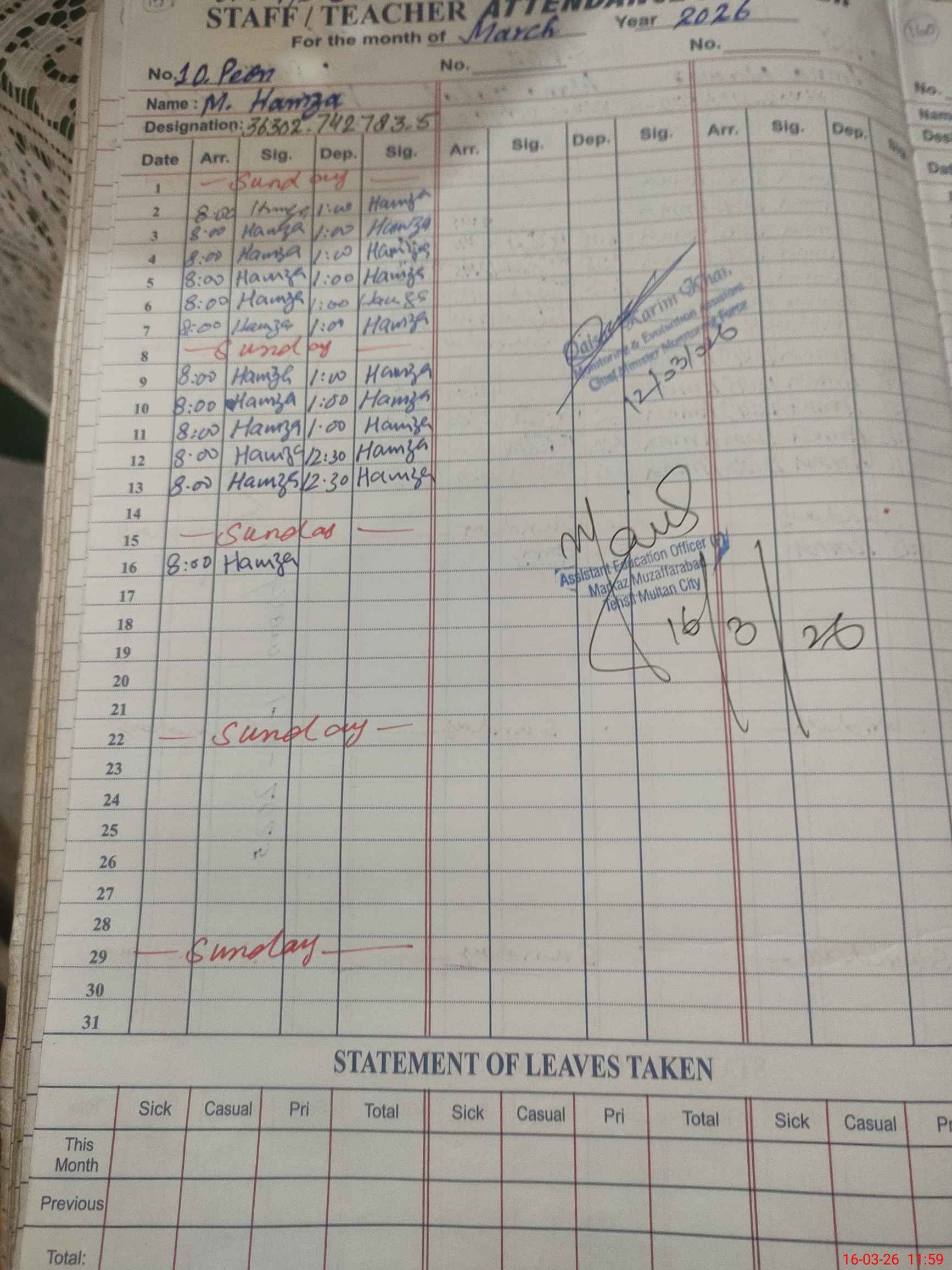 | 36**** | Wa**** Hi**** | PST Arts | Regular | 0 | 0 | 0 | 0 | 0 | 0 | 0 | 0 | 0 | Absent (Un-Authorized) |