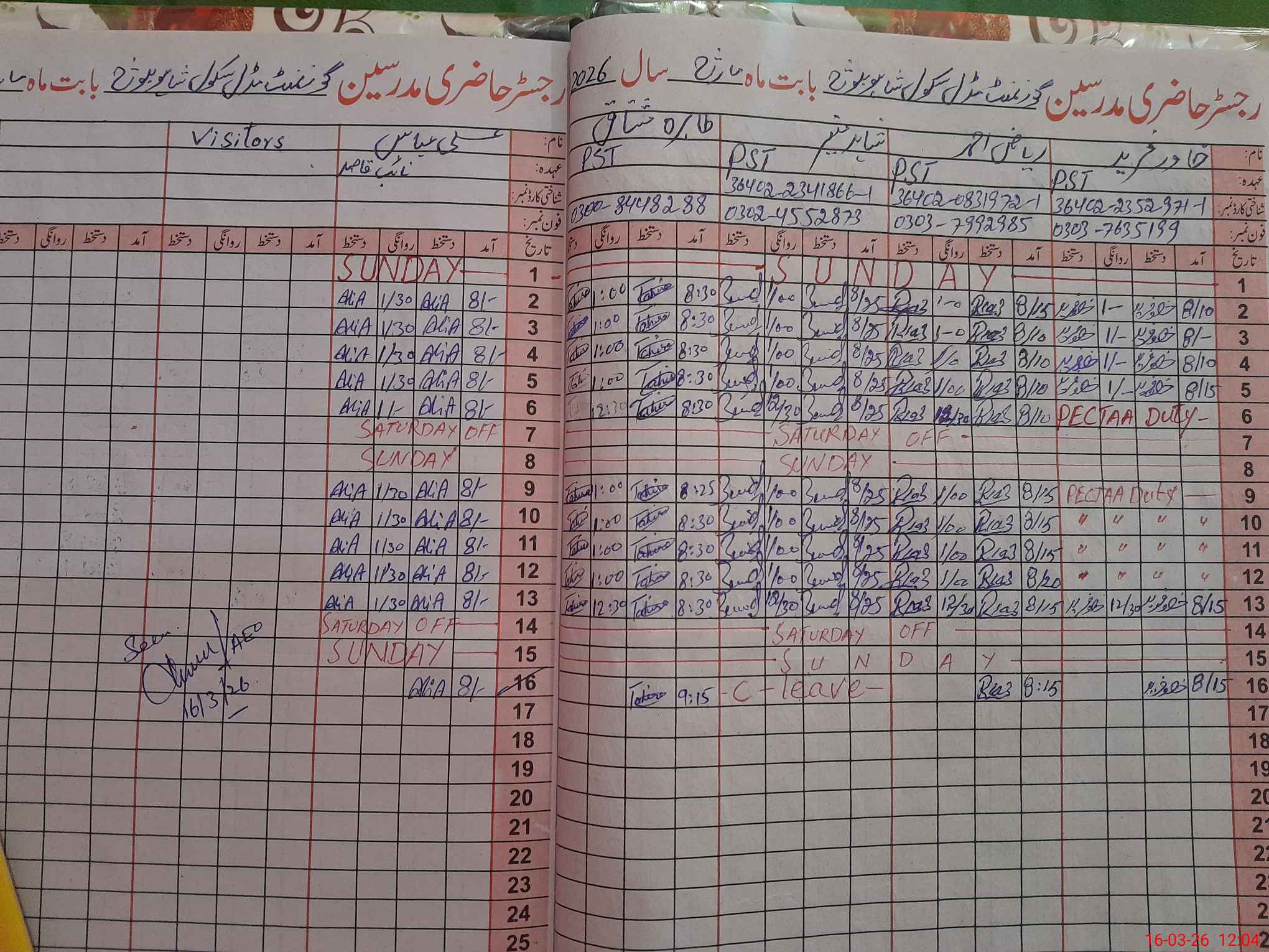 | CNIC | Full Name | Designation | R/C | Absence During Last Calender Month |