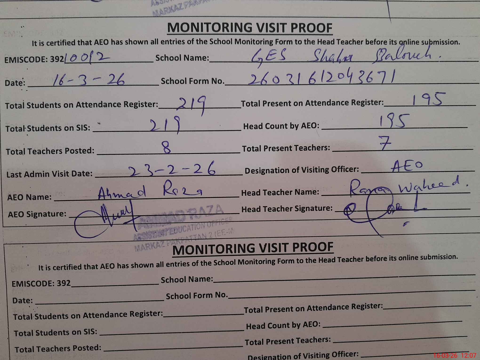 | Attendance Register | Head Teacher | MEA with School | Visit Proof |