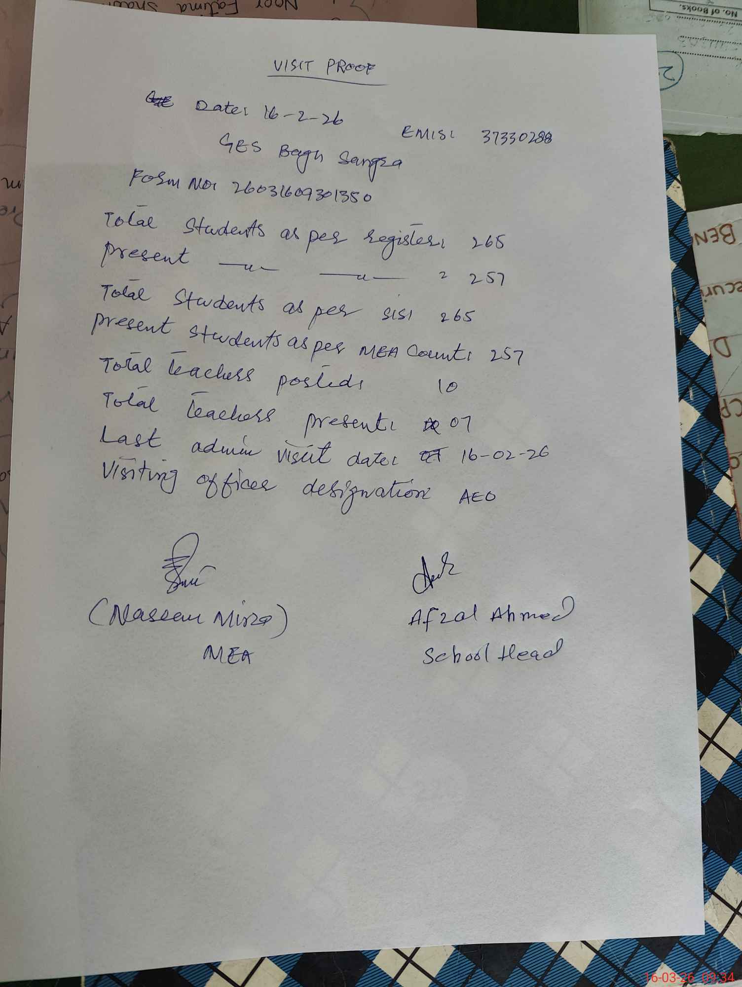 | EMIS Code: 37330288 | Name of School: GES BAGH SANGRA | |||