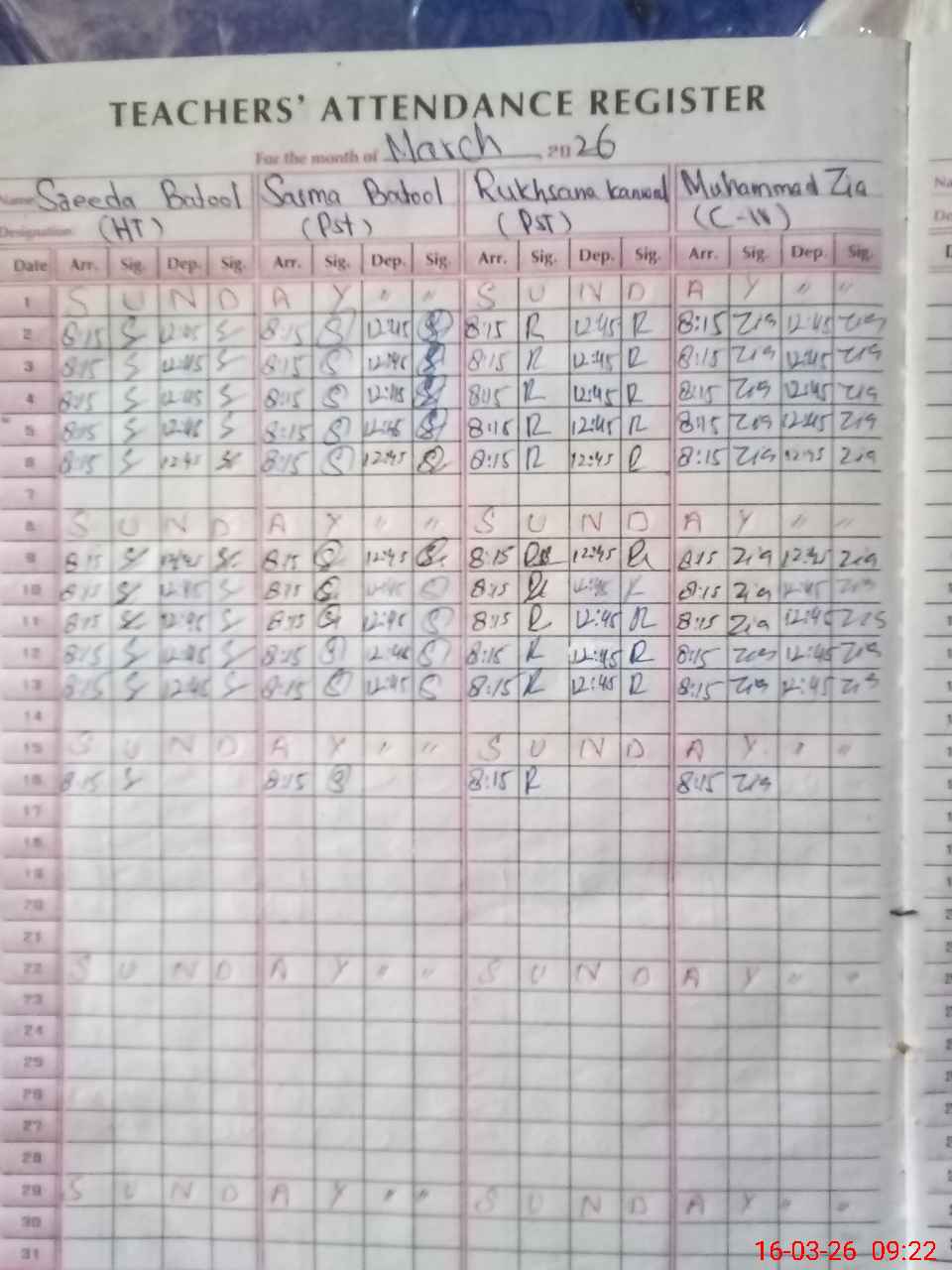 | Remarks (Use Separate Page if Required): Afternoon shift attendance register of students not updated Last attendance was updated on 03 rd March,2026. | |||||