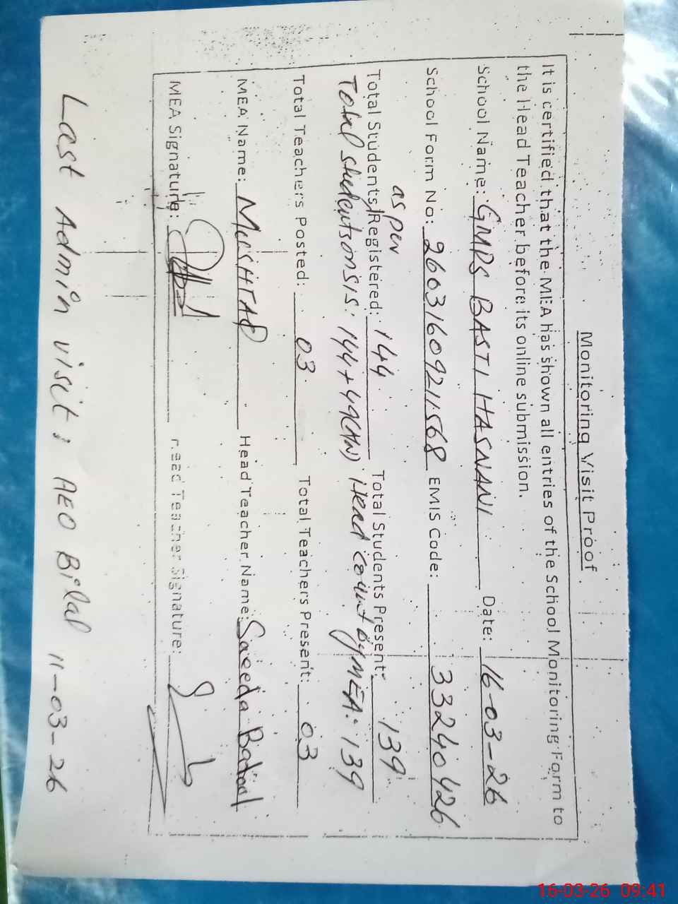 | Certified that this School was Inspected by the Undersigned MEA/DMO Today and the Information Stated Above is as Per Record. | |||||