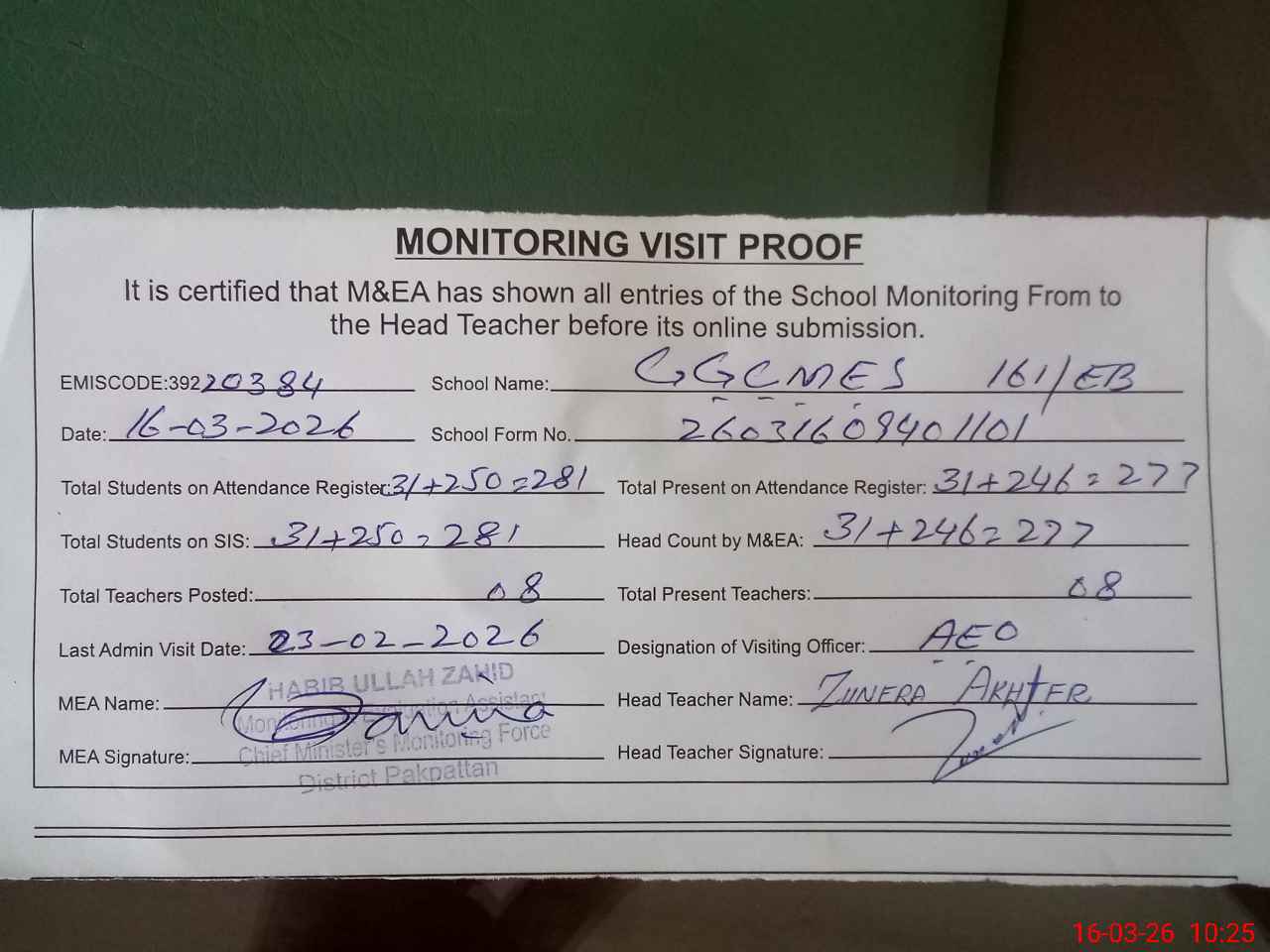 | Attendance Register | Head Teacher | MEA with School | Visit Proof |