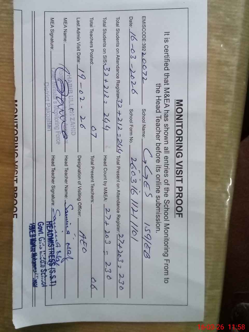 | Certified that this School was Inspected by the Undersigned MEA/DMO Today and the Information Stated Above is as Per Record. | |||||