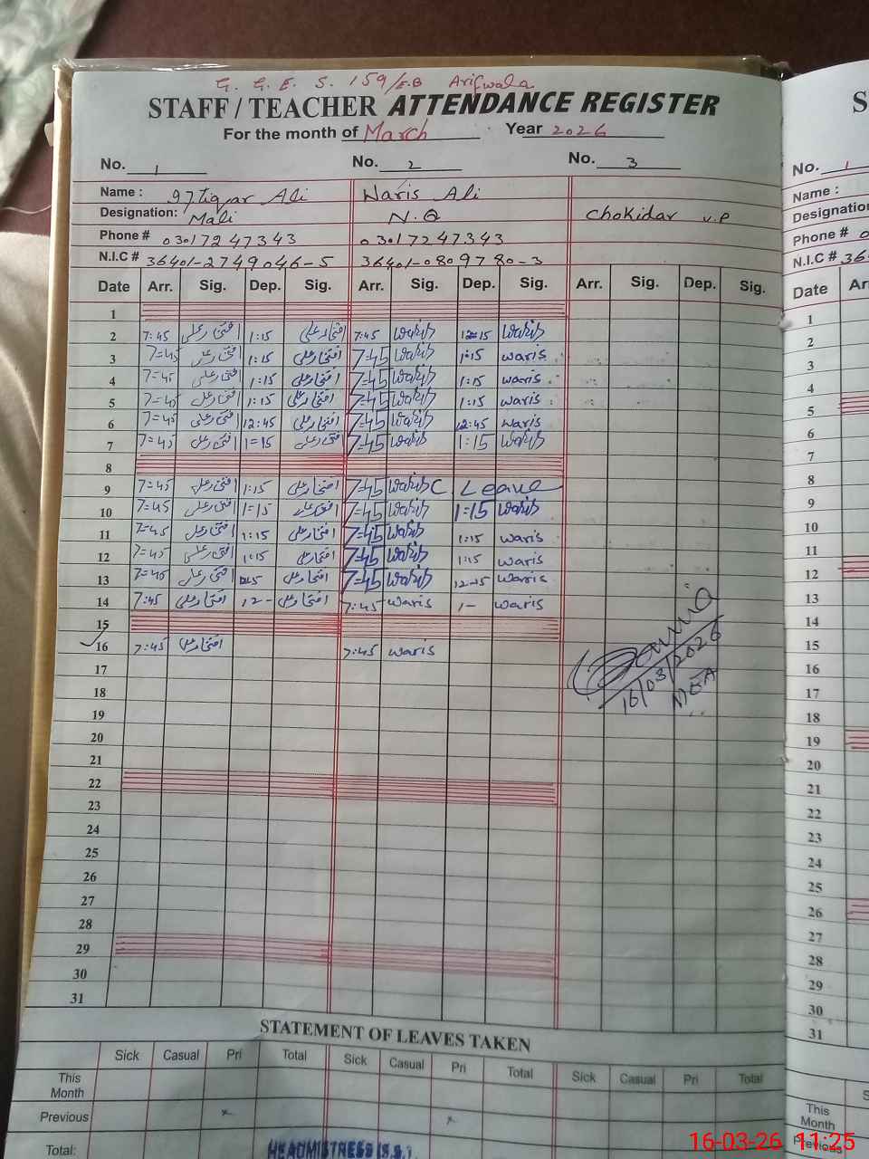 | CNIC | Full Name | Designation | R/C | Absence During Last Calender Month |