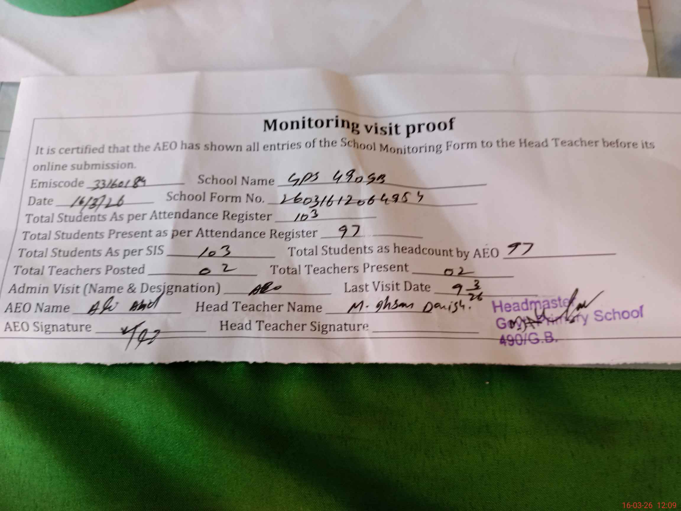 | Attendance Register | Head Teacher | MEA with School | Visit Proof |