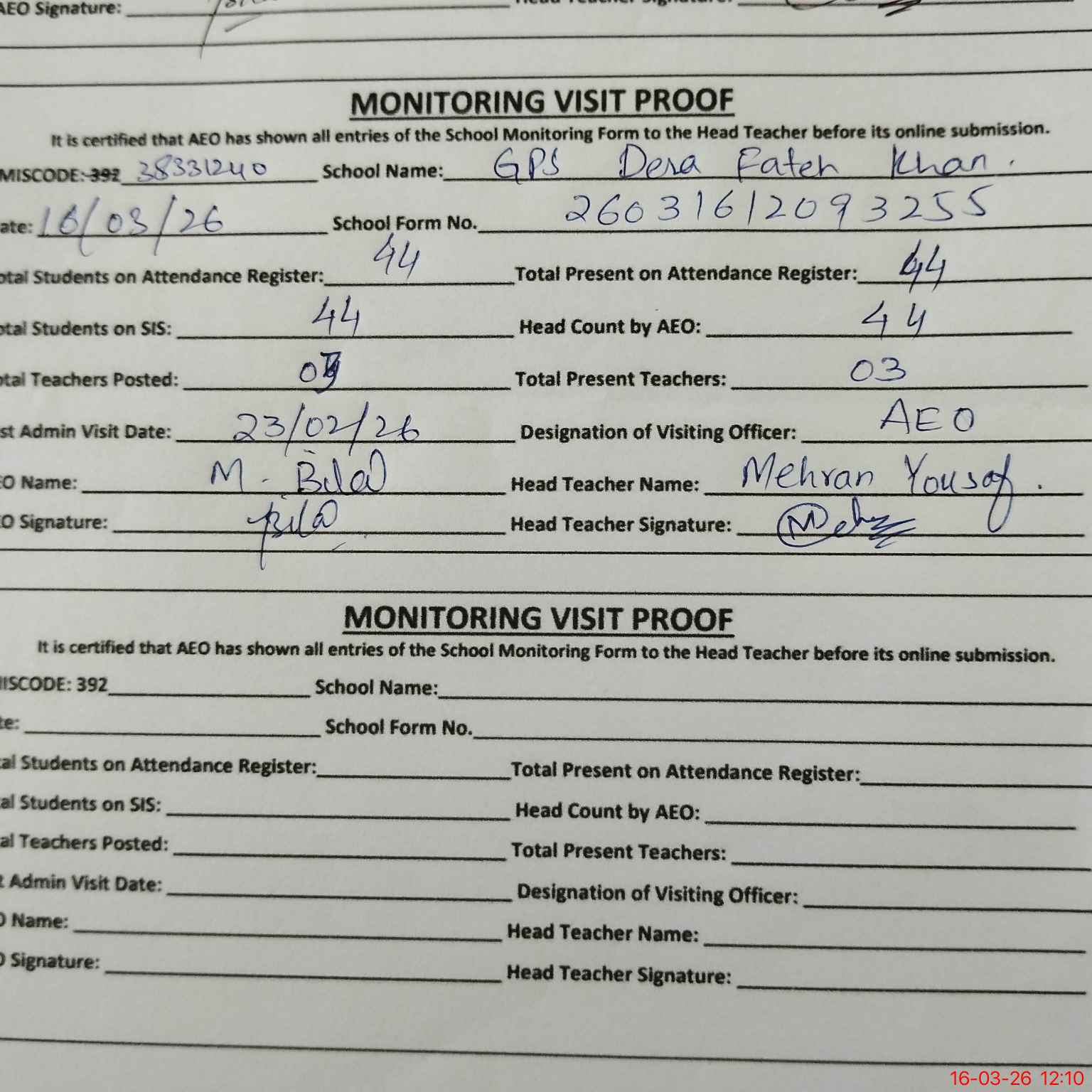 | Attendance Register | Head Teacher | MEA with School | Visit Proof |