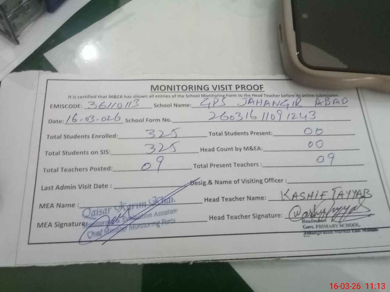 | Attendance Register | Head Teacher | MEA with School | Visit Proof |
