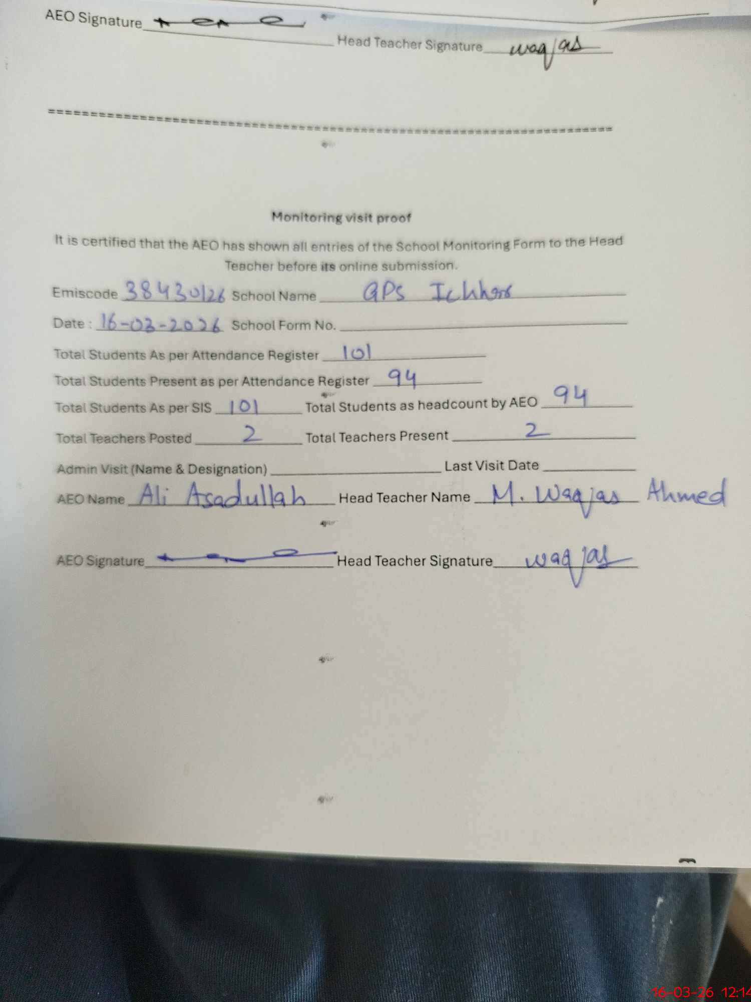 | Attendance Register | Head Teacher | MEA with School | Visit Proof |