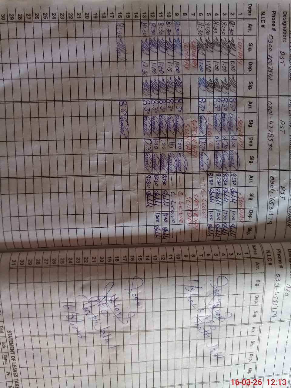 | CNIC | Full Name | Designation | R/C | Absence During Last Calender Month |